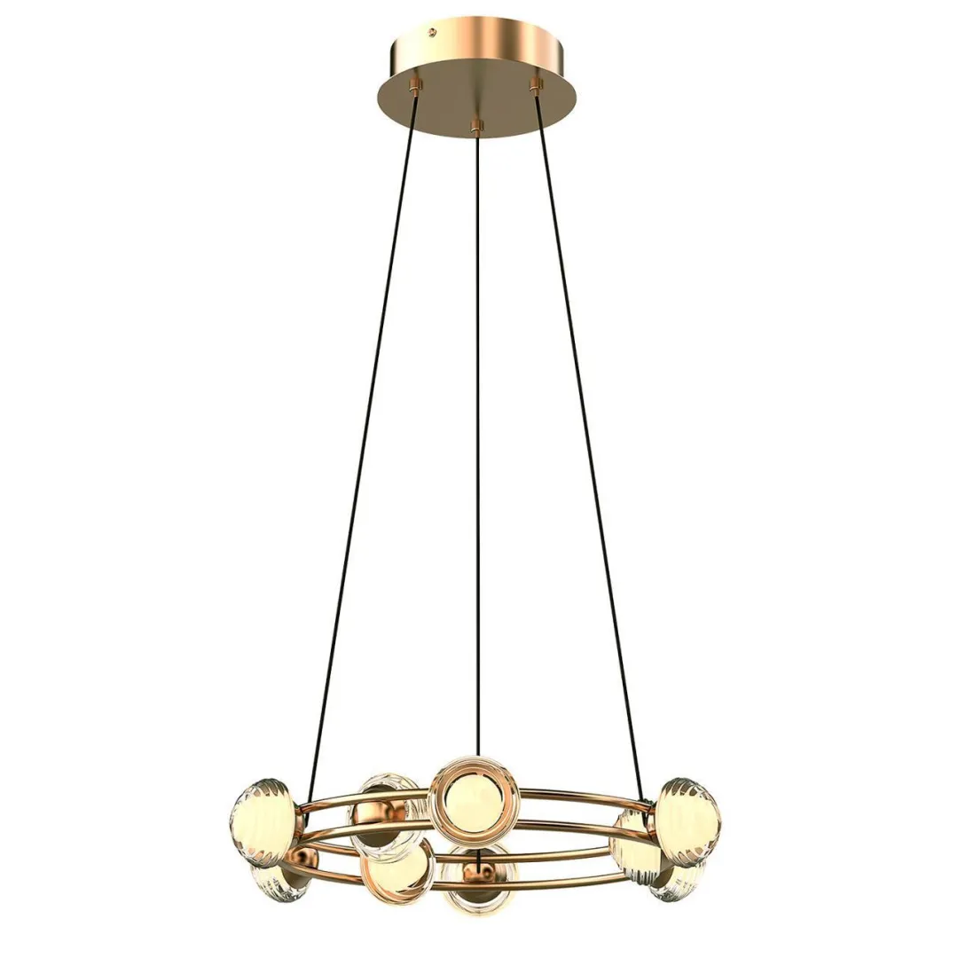 Каркас в цвете гальваническое золото, с тонкими металлическими кольцами и акриловыми рельефными плафонами, внутри которых расположена модуль LED, плафоны расположены как по внешнему, так и по внутреннему периметру кольца.