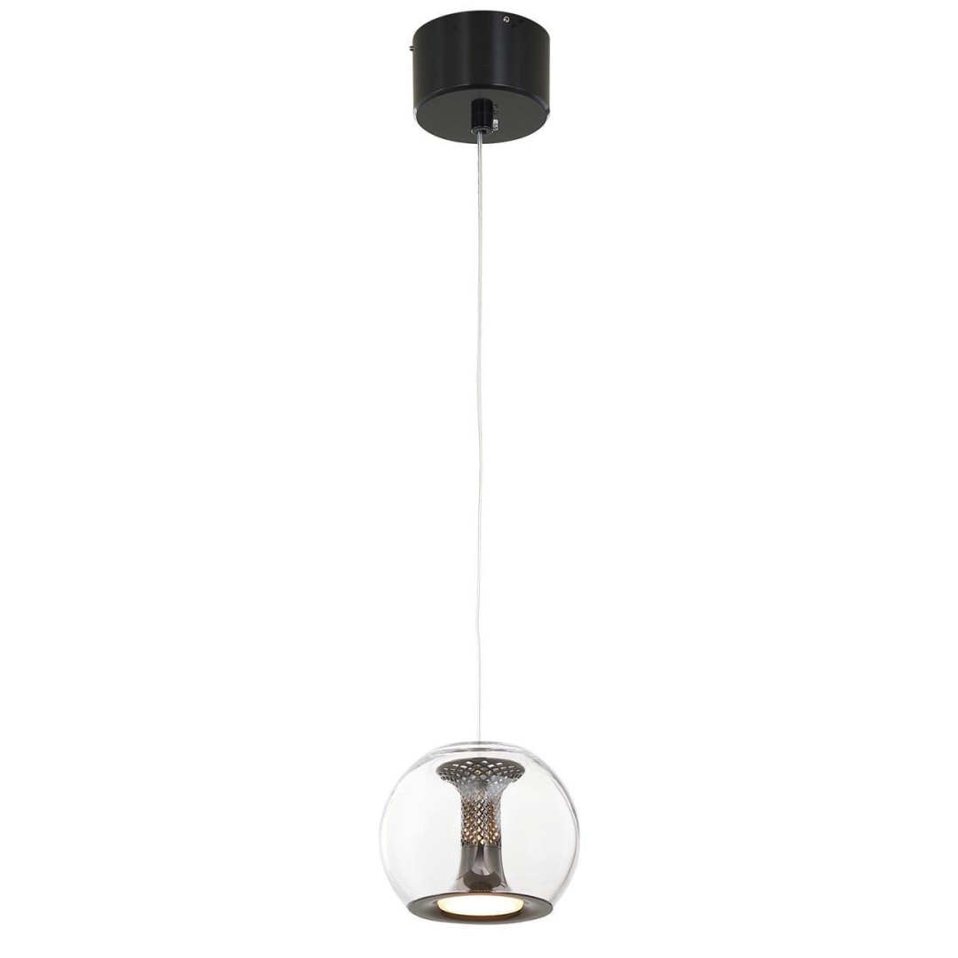 Металлический каркас черного цвета, плафон из выдувного стекла с внутренним декором в виде сетки из литого алюминия, в нижнюю часть плафона встроен двусторонний модуль LED  свет направлен вверх освещая внутреннюю часть плафона, и вниз в качестве основного источника света, регулируемая высота.