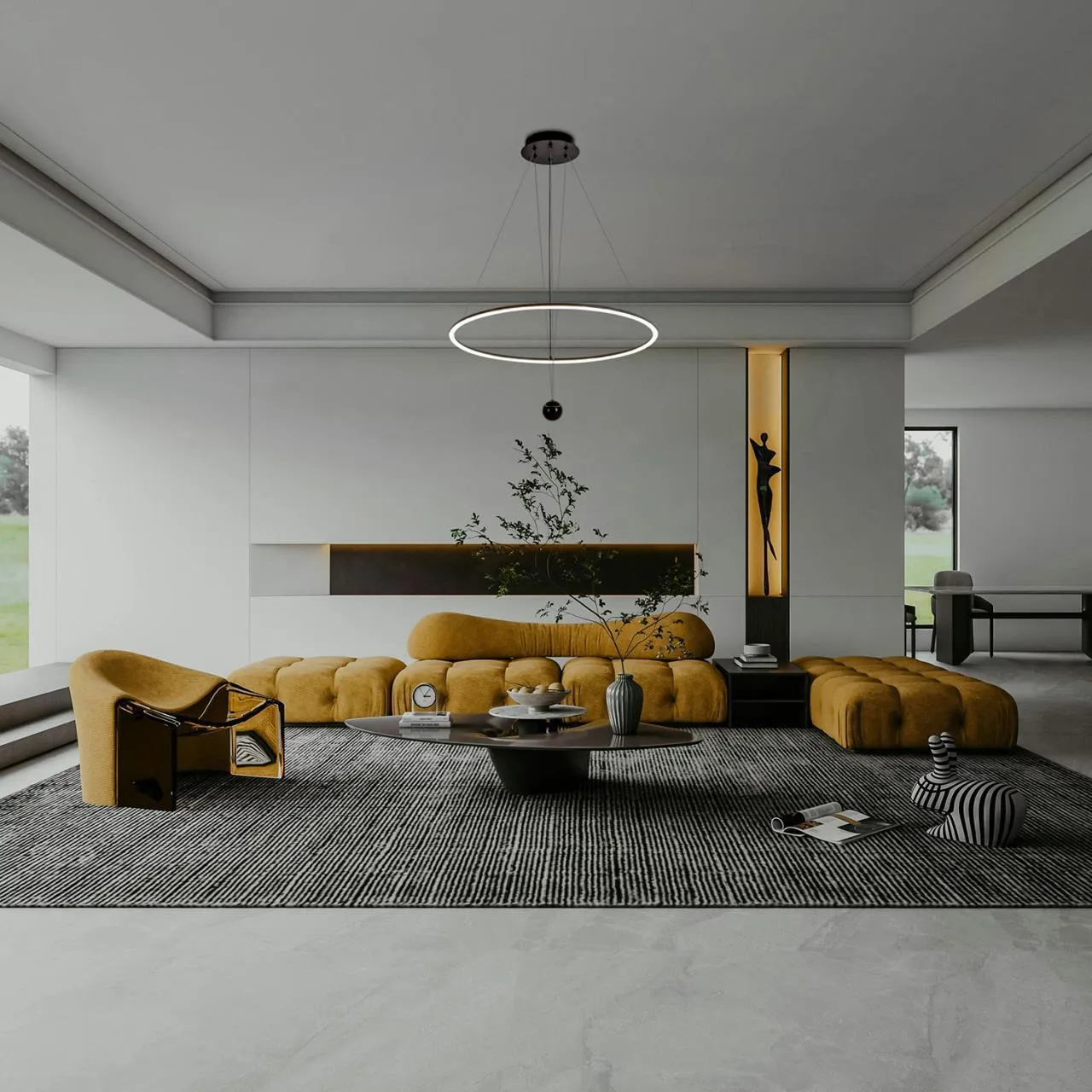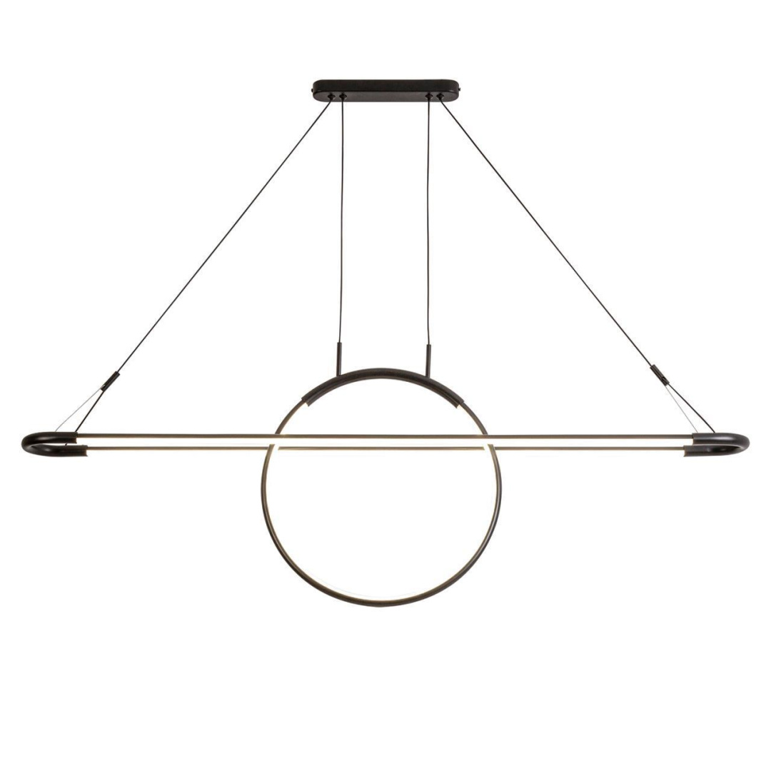 Подвесная люстра, металлический каркас черного матового цвета, рассеиватель из акрила, возможность менять высоту внешнего плафона с помощью подъема и опускания центрального элемента кольца, модуль LED.