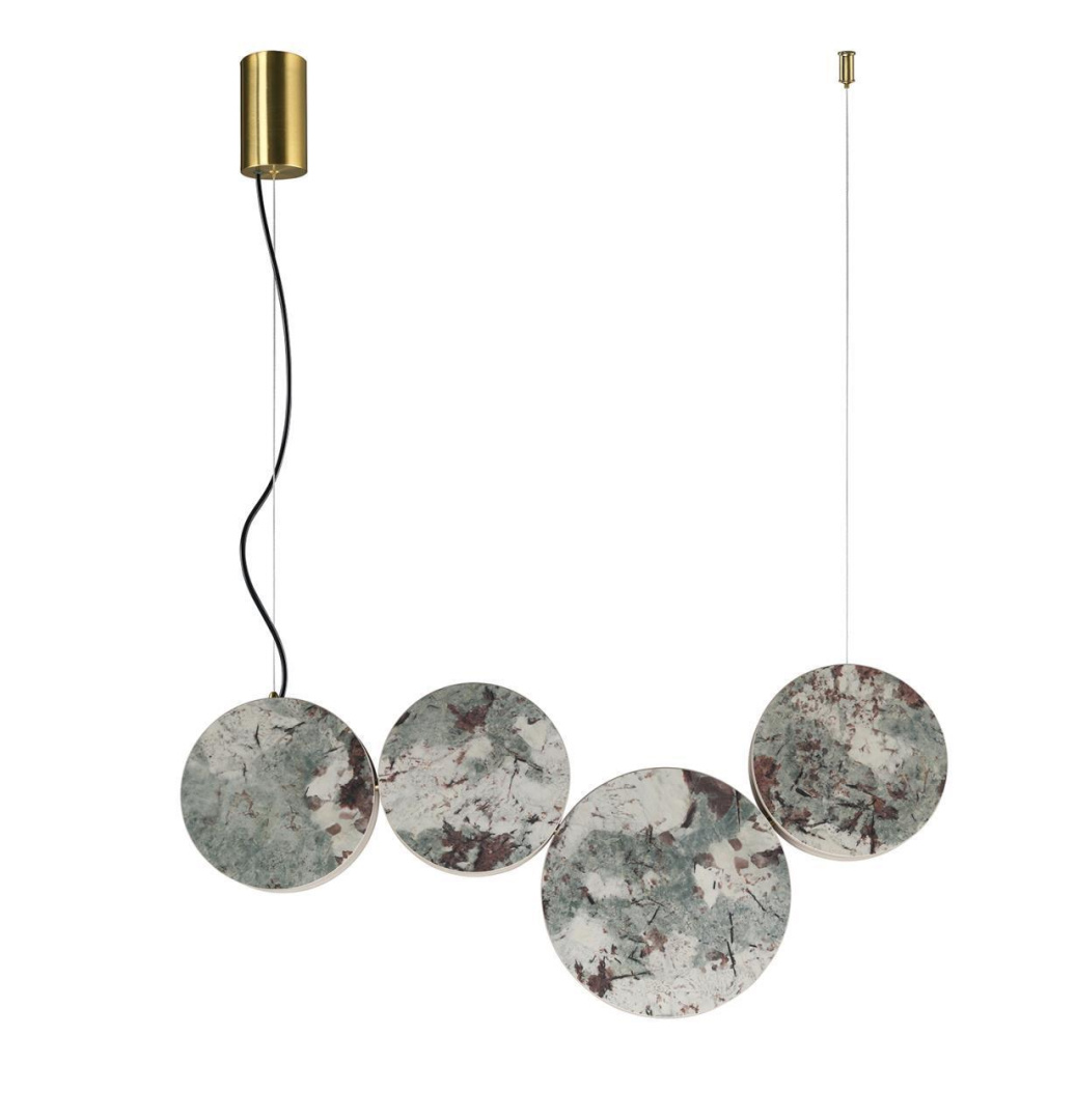 Двусторонний плафон из искусственного мрамора серозеленого оттенка в форме диска, светящегося по контуру, чаша крепления золотого цвета.