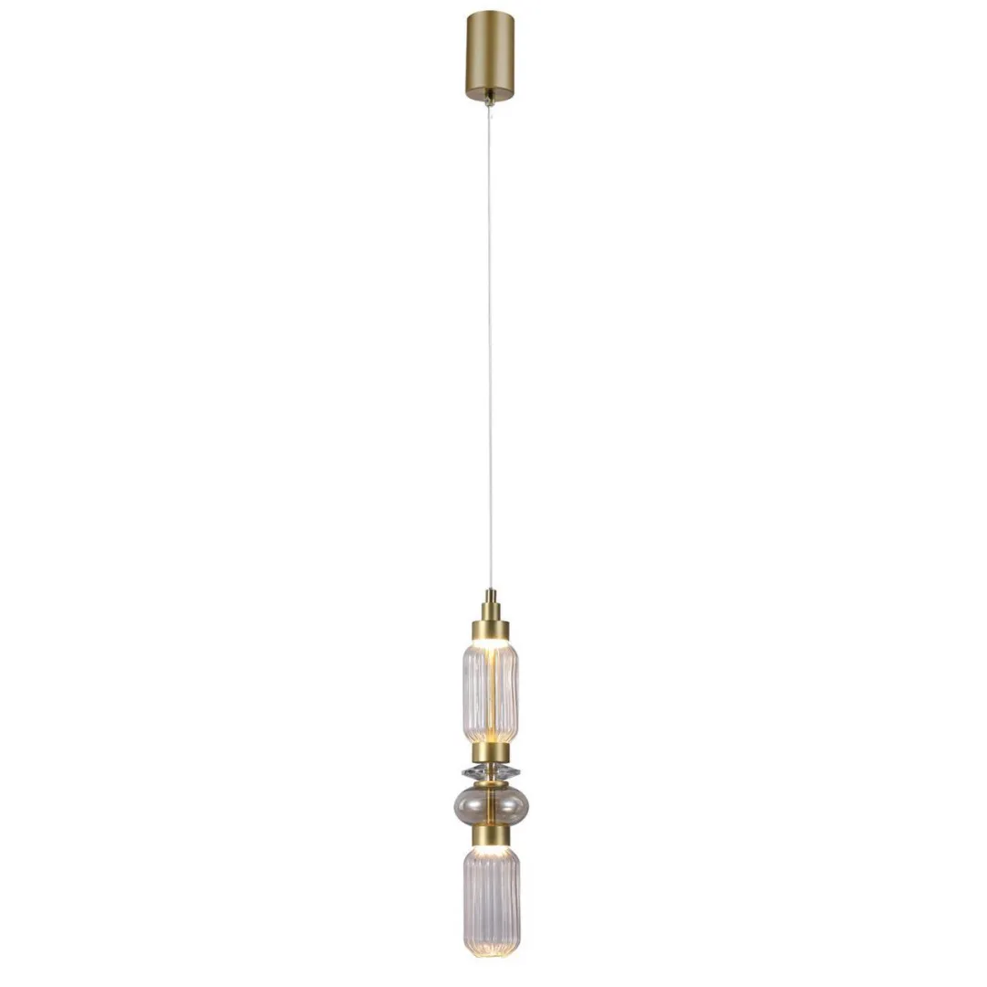 Металлический каркас в цвете латунь, плафон из стекла, выполненного по муранской технологии в прозрачном, янтарном и дымчатосером цвете, модуль LED, регулируемая высота.