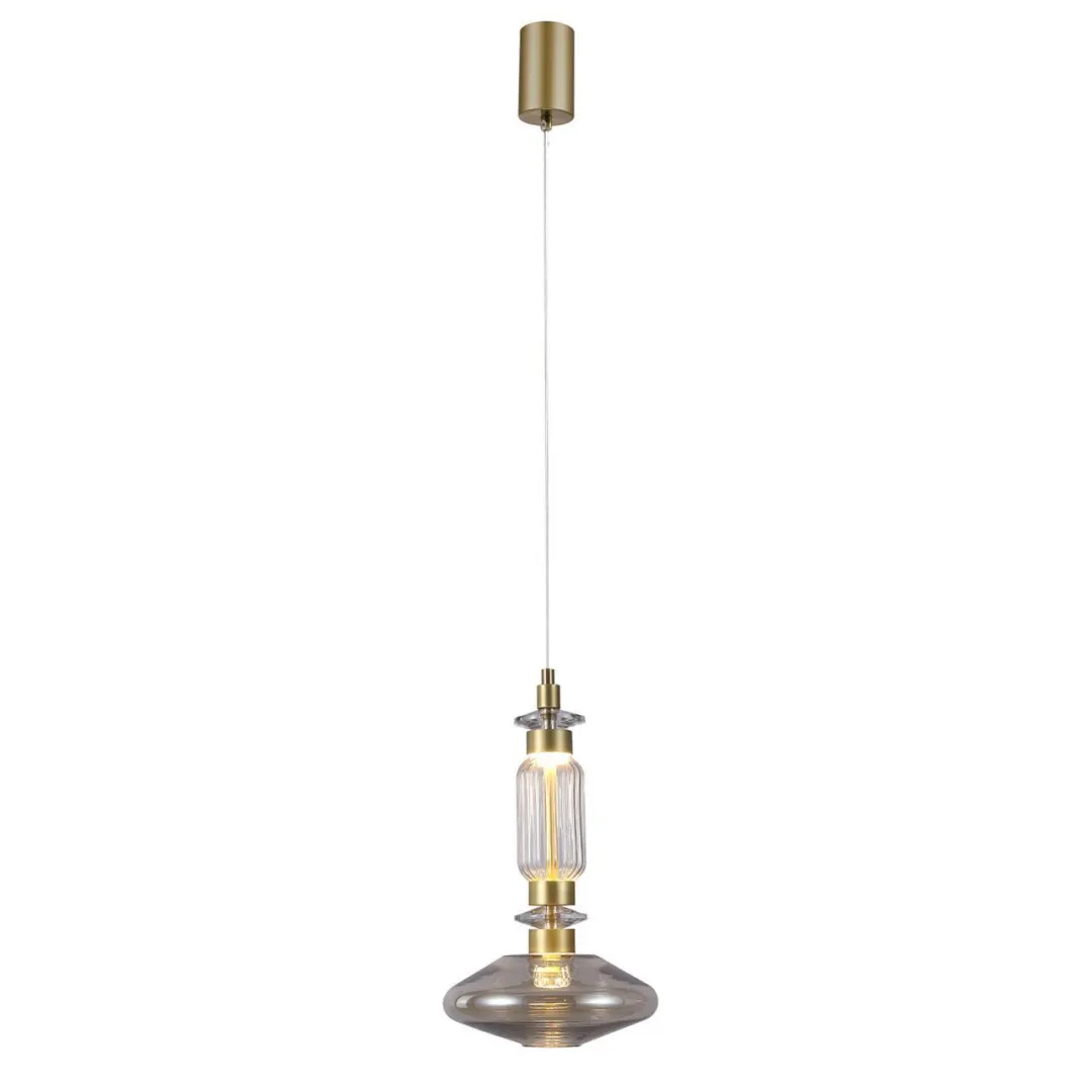 Металлический каркас в цвете латунь, плафон из стекла, выполненного по муранской технологии в прозрачном, янтарном, дымчатосером и краснокоричневом цвете, модуль LED, регулируемая высота.