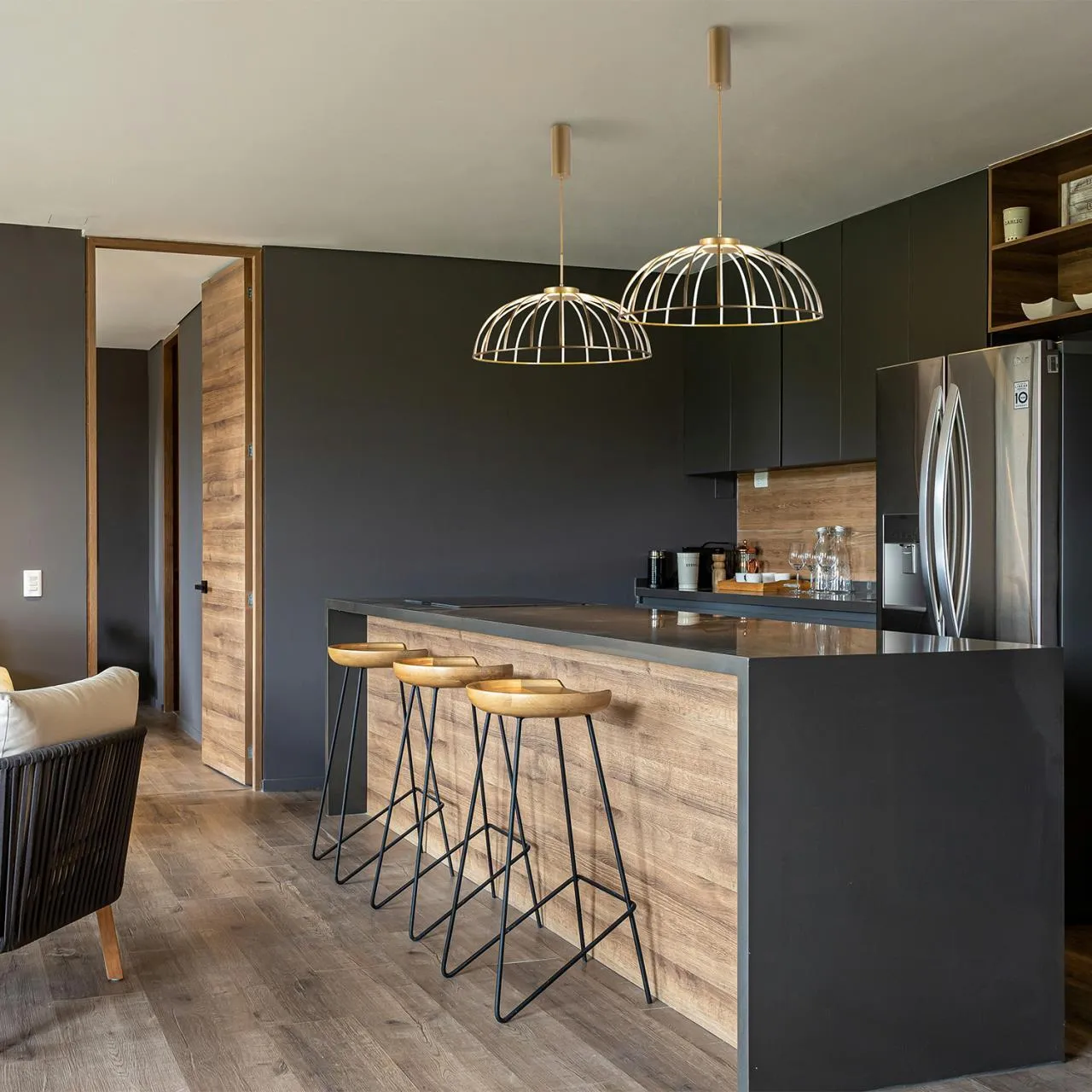 Металлический каркас в темносером цвете. Источником света являются расходящиеся из центра лучи, выполненные из тонких металлических трубок в лентой LED, регулируемая высота.