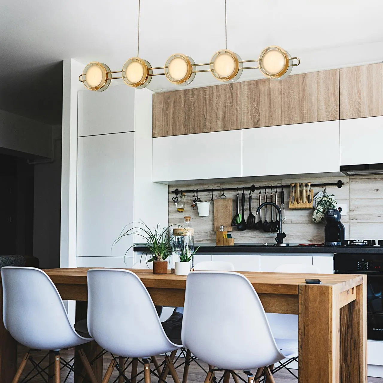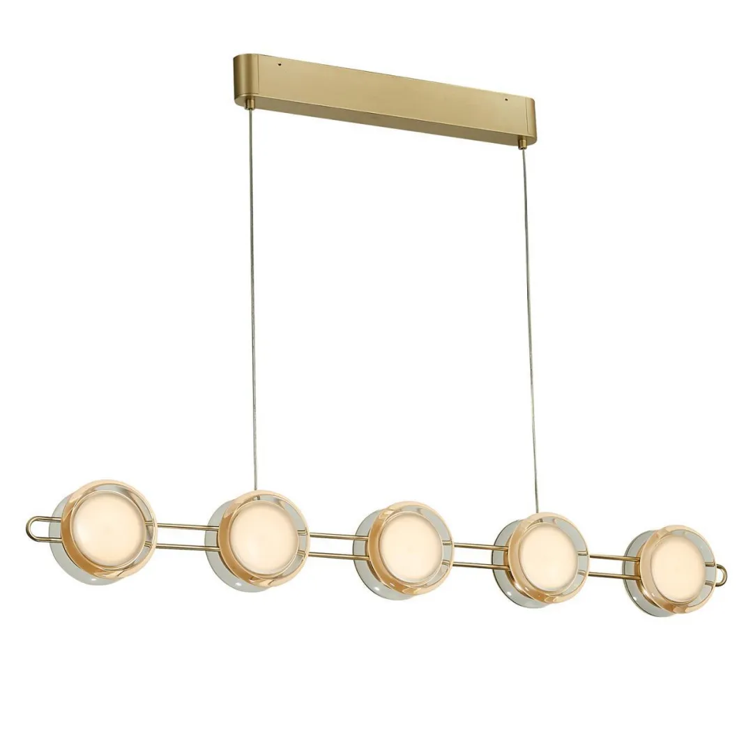 Металлический каркас в цвете золото, акриловые плафоны в виде дисков с прозрачным объемным ободком и плоской матовой внутренней частью со встроенным модулем LED, регулируемая высота.