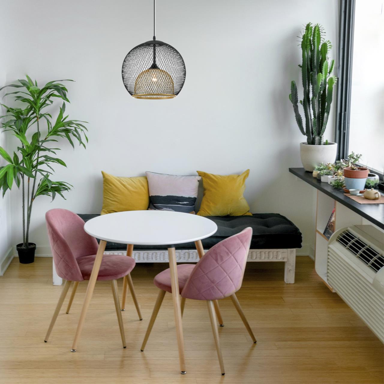 Подвесной светильник LEONELA в стиле лофт интересен двойным плафоном из сетки: черный снаружи и золотой внутри. Блеск желтого металла усиливается от света включенной лампы, при этом черная вуаль второго большого полукруглого абажура усмиряет и приглушает излишнюю яркость позолоты. Металлический полупрозрачный абажур не сильно скрадывает свет, наполняя комнату уютным освещением.