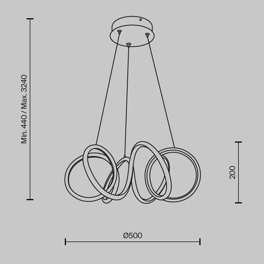 Металлическая арматура, цвета - черный, латунь. Закругленные световые элементыиз силикона со  встроенным LED-источником света по всему периметру. Регулируемый диапазон цветовой тмепературы 2600К-3500К для светильников в латуни и 3000К-4000К для черных. Регулируема длина тросов.  Фантазийный образ хаотичных фрагментов свободно парящих в пространстве.