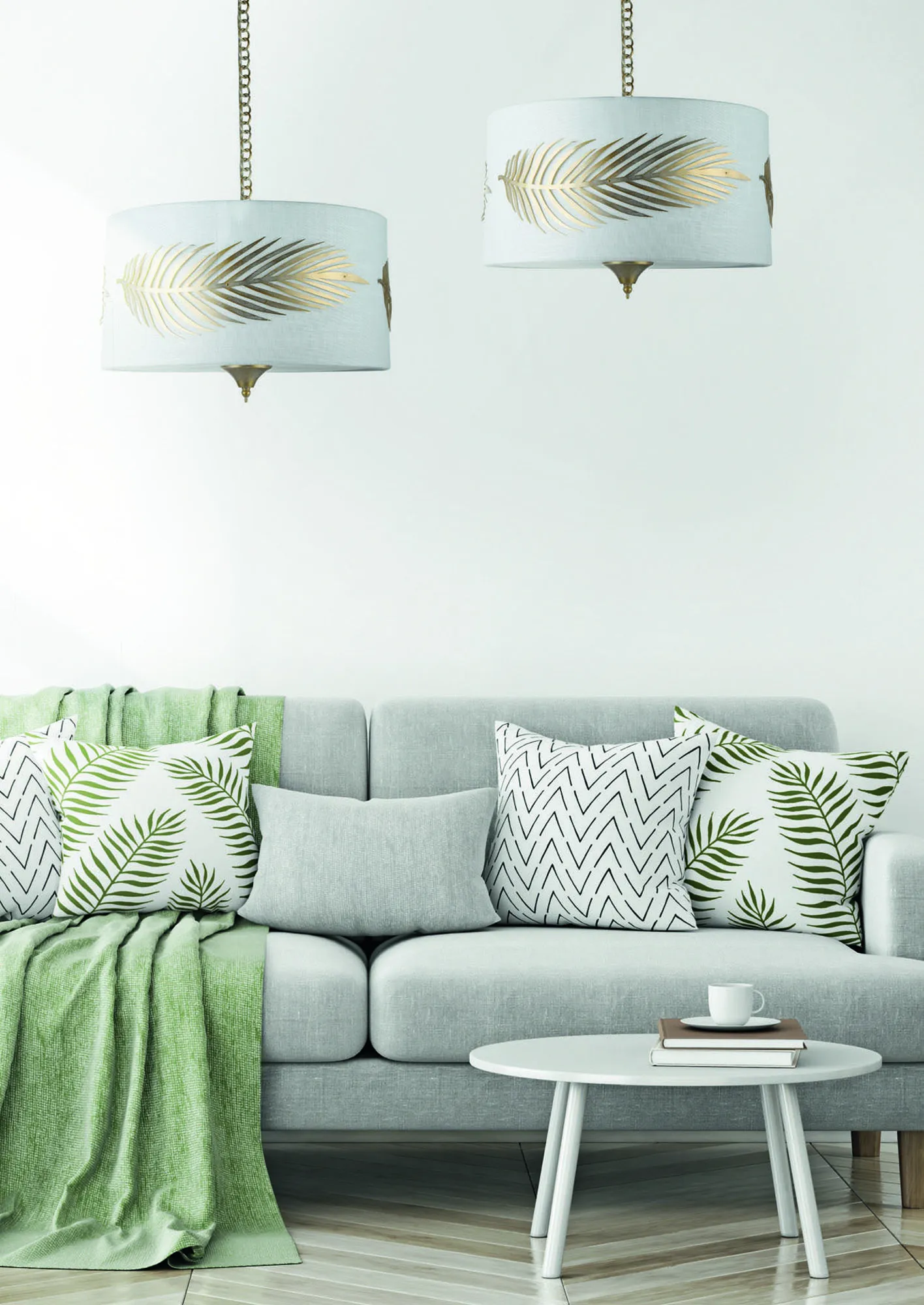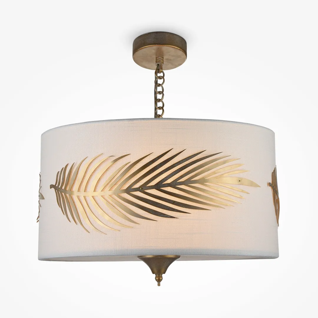 Золотая пальмовая ветвь — символ победы и триумфа. Вырезанная из листового металла, она расположилась на абажурах светильников серии. Арматура изготовлена из металла золотого цвета. Абажуры из белой ткани, нанесенной на ПВХ. Внутреннее устройство подвесных светильников скрыто за рассеивателем, который фиксируется декоративным наконечником. Высота подвесных светильников регулируется длиной цепи.
