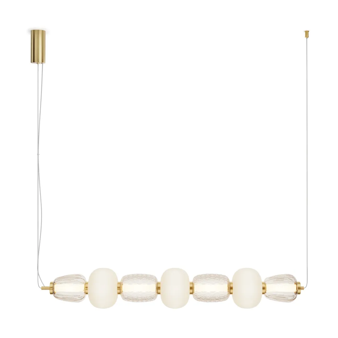 Металлическая арматура, цвет - золото, хром. Микс плафонов округлых и вытянутых форм из белого матового и прозрачного стекла с сетчатым и с линейным повторяющимся рельефным рисунком. Регулируемая высота подвесных моделей, провод - 3 метра. LED-источник света, цветовая температура 3000К.