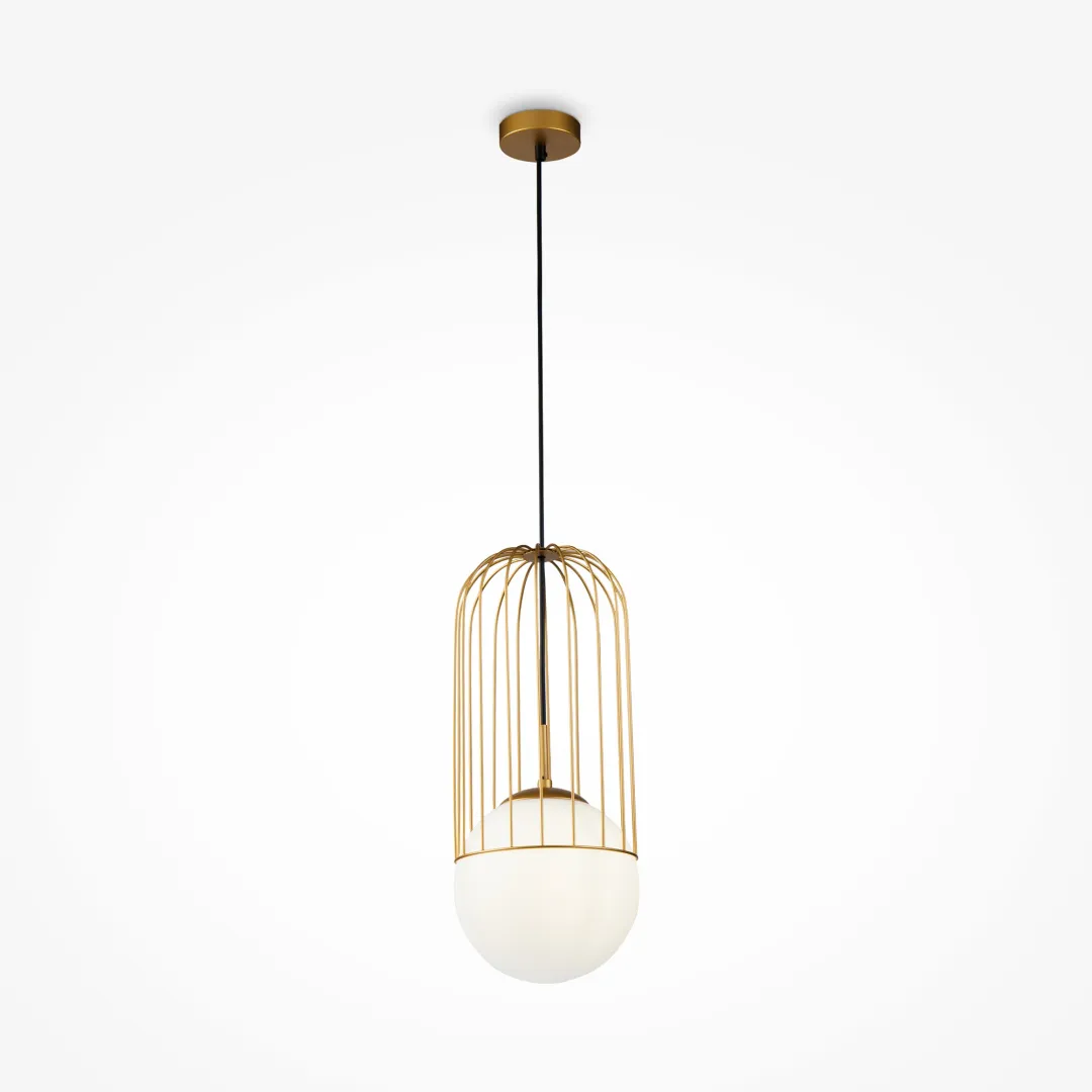 Конструкция светильников представляет собой матовый стеклянный плафон, сверху которого закреплена декоративная пространственная решетка из стальной проволоки. Металлические детали светильников окрашены в золотой цвет. Модели серии представлены в трех разных размерах. Высоту подвесных светильников можно отрегулировать, изменяя длину шнура.
