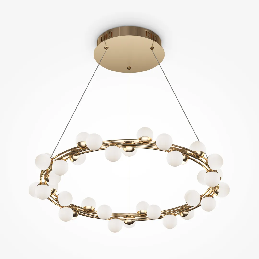 Широкая окружность, обрамленная «молекулами» света,обеспечивает максимально равномерное и яркое освещениепространства. «Атомный» или «молекулярный» дизайн,отражающий естество и природную сущность каждого предмета,не теряет актуальности и позволяет выгодно расставлять акцентыв интерьере. Одна из характерных черт подобных светильников—невесомость конструкции. За счет тонких, практически невидимыхтросов, которые регулируются по высоте, создается ощущение, что люстра парит в воздухе. Металлическая золотая арматура и матово-белые миниатюрные плафоны с легкостью дополнят любую палитру, а представленные в коллекции подвесная люстра и бра станут готовым ансамблем для освещения гостиной, спальни, прихожей.