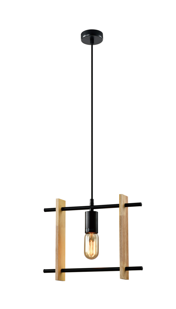 Подвесной светильник на 1 лампу Е27 40 Вт. Высоту подвеса можно отрегулировать при монтаже светильника на потолок, укоротив трос. Основание подвеса круглое, металлическое, чёрного цвета. Накладной способ установки позволяет быстро разместить подвес на любом потолке. Реечный каркасный корпус окрашен гальваническим способом в два цвета – чёрный и светлое дерево.