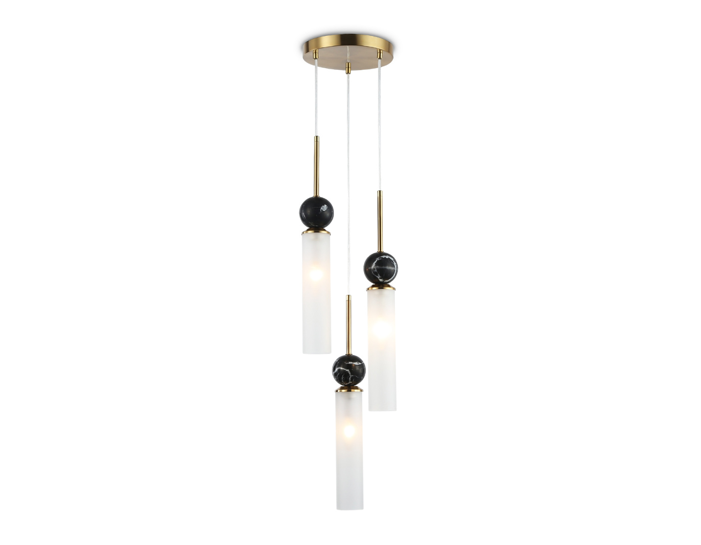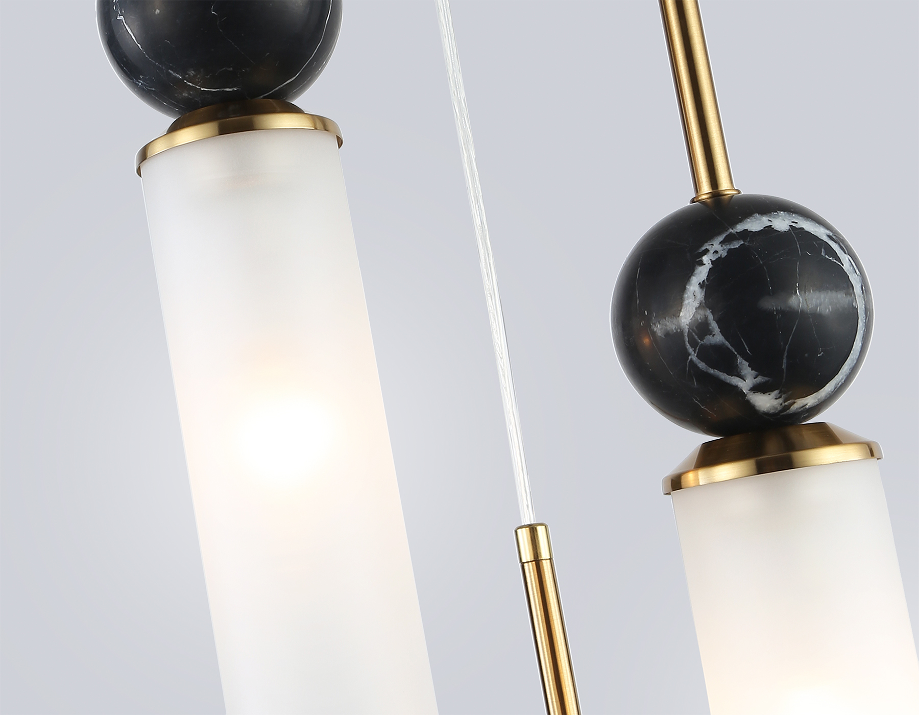Подвесной светильник с мрамором из коллекции HIGH LIGHT. Модель LH53262 представлена в современном стиле модерн. Светильник выполнен из металлического каркаса цвета латунь, стеклянных плафонов белого цвета и декорирован элементами из мрамора черного цвета. Для данной модели подойдет сменная лампа с цоколем Е14. Светильник будет прекрасным дополнением в любом помещении.