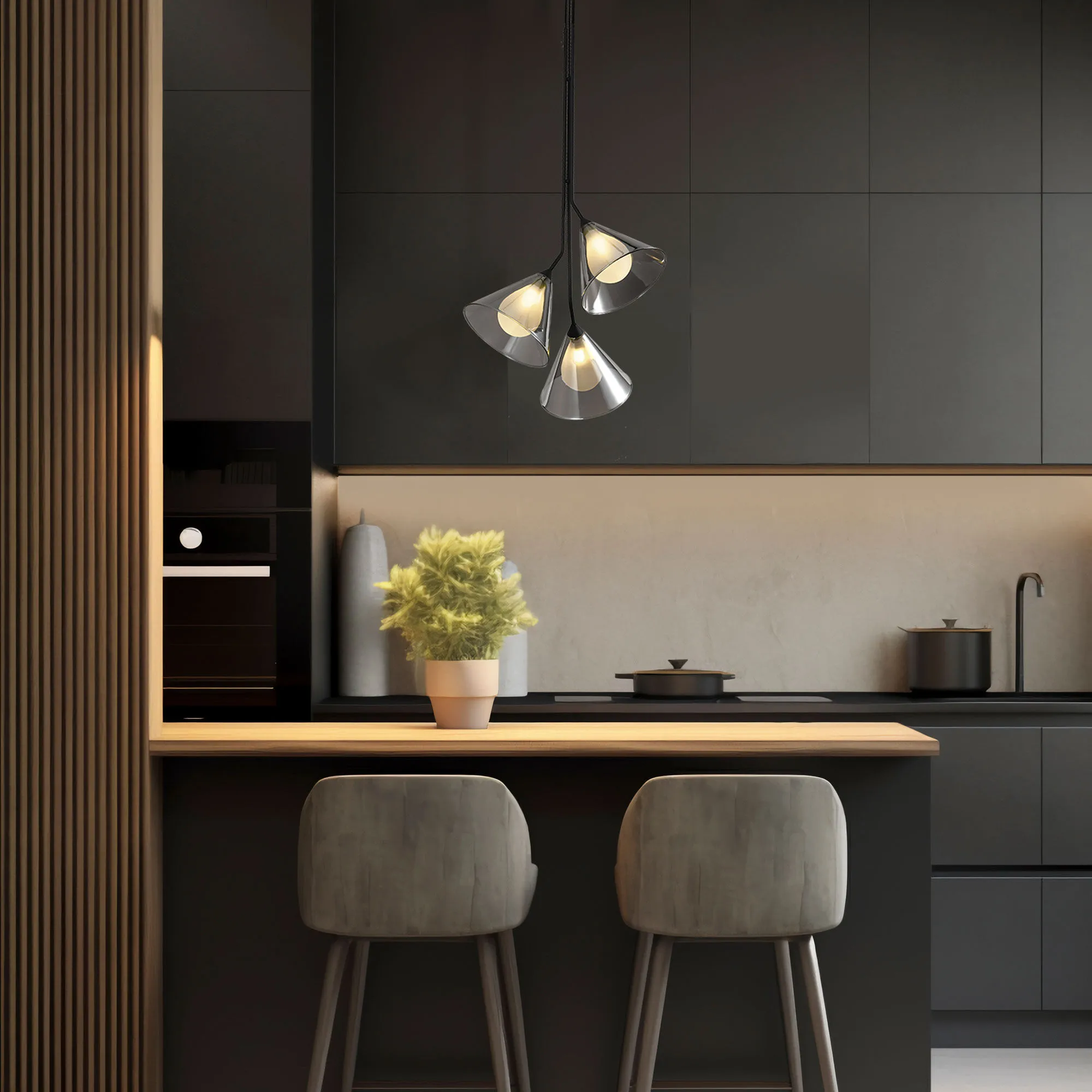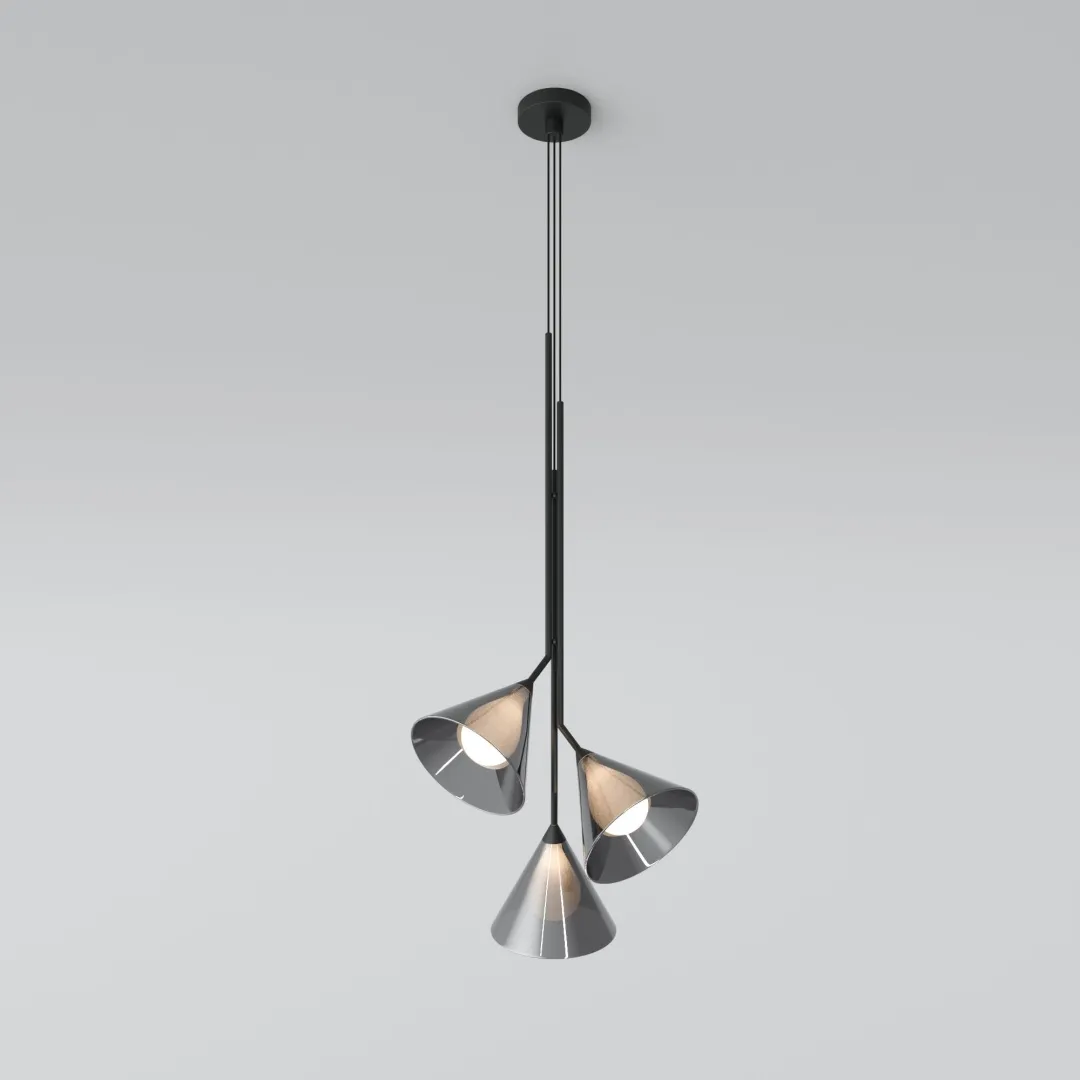 Конусовидные дымчатые плафоны метафорически обнимают округлые молочные плафоны, создавая атмосферу загадочности и уюта. Утонченная черная арматура придает изделиям лёгкость, позволяя им гармонично вписываться в разнообразные стилистические решения.