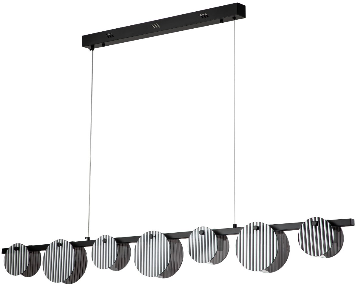 Люстра подвесная вытянутой формы коллекции Relux выполнена из металла, окрашенного в черный цвет, и рифленых плафонов из стекла круглой формы дымчатого цвета. Люстра комплектуется пультом дистанционного управления 2,4G и драйвером высокого качества с европейским стандартом T?V. Пульт дистанционного управления обеспечивает переключение трех режимов световой температуры и диммирование.