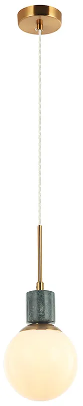 Светильник подвесной из коллекции Sharo выполнен из металла, гальванизированного в цвет бронзы, и декорирован натуральным мрамором. Источник света закрыт белым глянцевым плафоном. Провод на подвесе выполнен из перекрученного прозрачного шнура в винтажном стиле. Премиальное качество и неповторимыи? дизаи?н светильников идеально подои?дут как в классические, так и современные дизайнерские интерьеры.