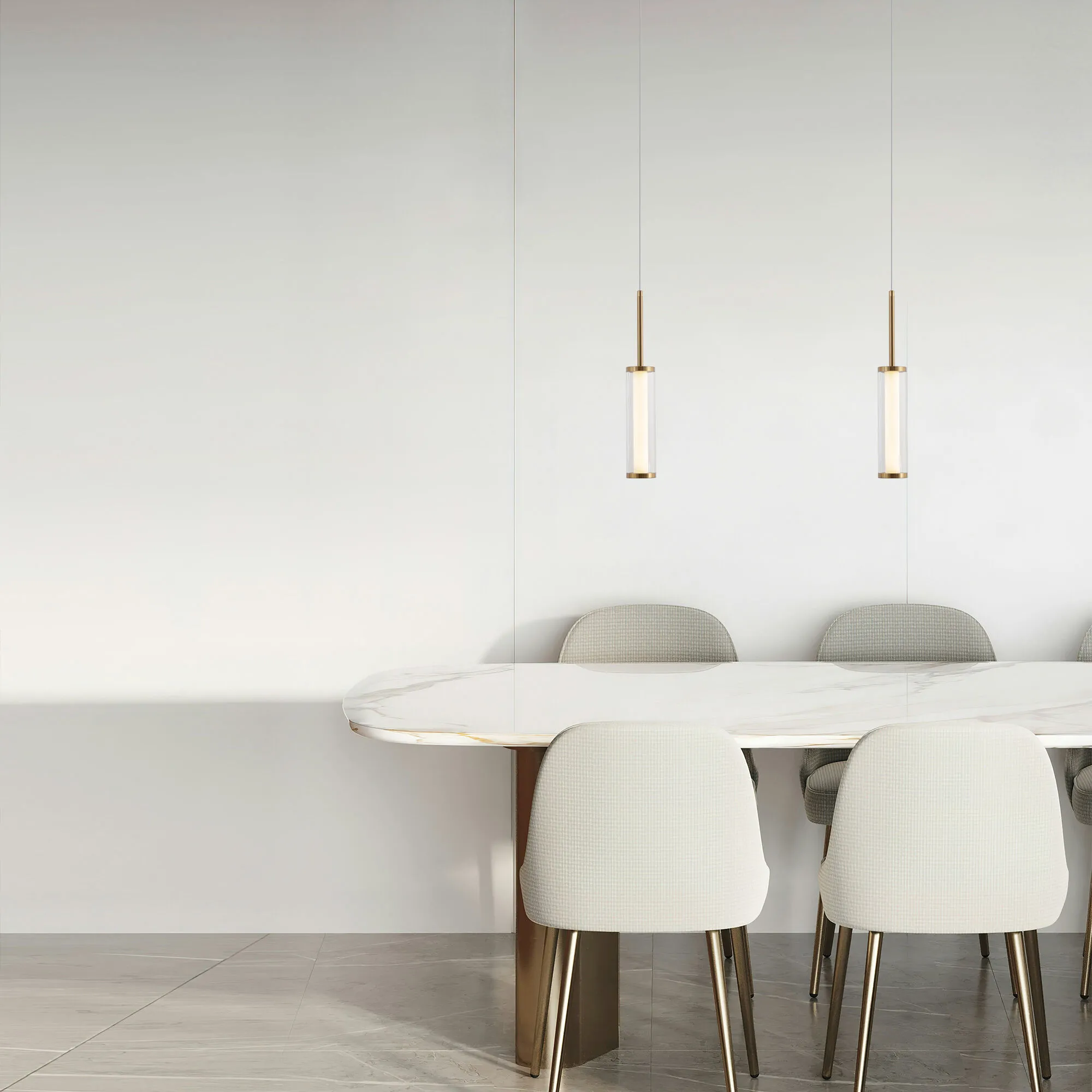 Белые трубчатые плафоны, дополненные прозрачным стеклом, создают эффект визуального парения, мягко рассеивая свет. Элементы по форме напоминают яркие векторные стрелы, которые указывают путь к инновационным идеалам, соединяя функциональность с эстетической выразительностью.