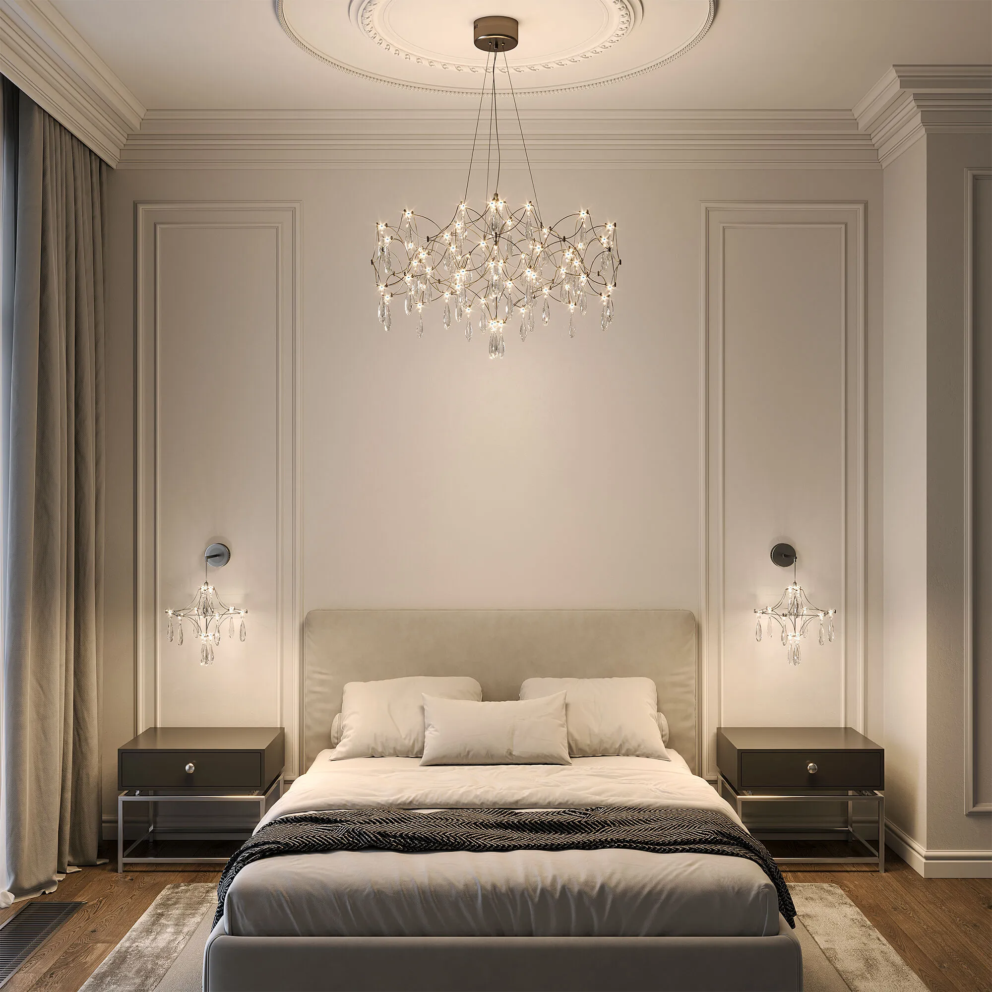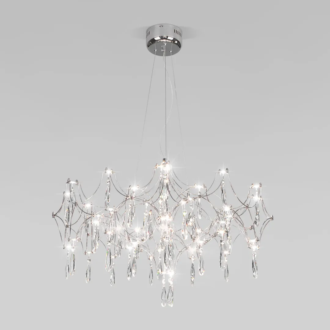 3D-дизайн коллекции Tense обеспечивает равномерное объемное освещение, наполняя комнату мягким светом. Светодиоды собраны в изящную световую композицию, способную стать главным акцентом в помещении. Проволочная арматура в цвете хром, украшенная хрустальными подвесками, создает игру света и тени, придавая композиции визуальную легкость. Светильник гармонично сочетает утонченный дизайн и функциональность. Смена цветовой температуры позволяет выбирать между теплым, нейтральным и холодным светом, в зависимости от настроения или задачи.