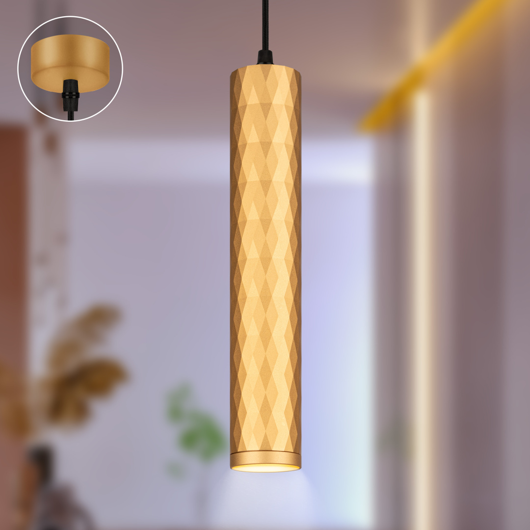 Подвесной светильник PL15 GD выполнен в фактурном рисунке "ромб". Притягивает и завораживает, создает новые грани красоты и изысканности. Корпус выполнен из металла, рисунок нанесен станком ЧПУ и покрыт устойчивой порошковой краской, которая после нанесения запекается в печи при температуре 210°С. Светильник предназначен под лампу MR-16 с цоколем GU10, напряжение питания ~230В 50/60Гц, материал металл, цвет светильника золотой, размер D55хH300мм, длина провода 1200 мм, максимальная мощность лампы 12Вт, степень защиты IP20