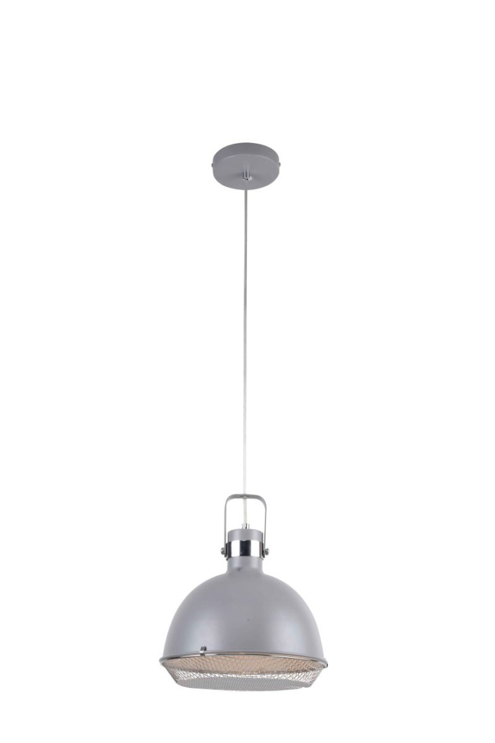 Одиночный подвес из серии Oregon имеет металлическую арматуру окрашенную в серый цвет и металлический плафон, окрашенный в цвет арматуры. Держатель плафона гальванизирован в цвет хрома. С внутренней стороны плафон окрашен в белый цвет, что усиливает световой эффект. Плафон подвеса декорирован сеткой, окрашенной в серый цвет.