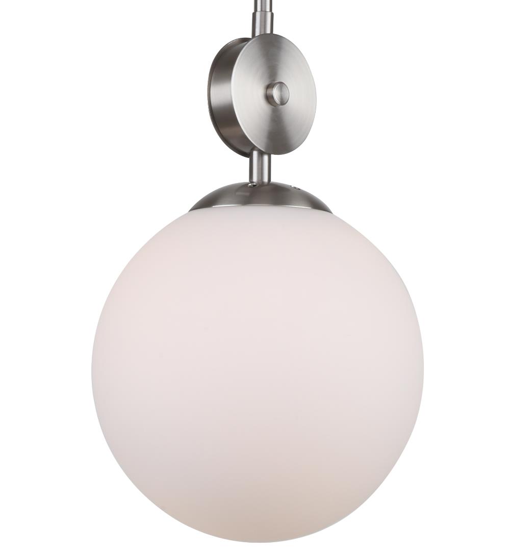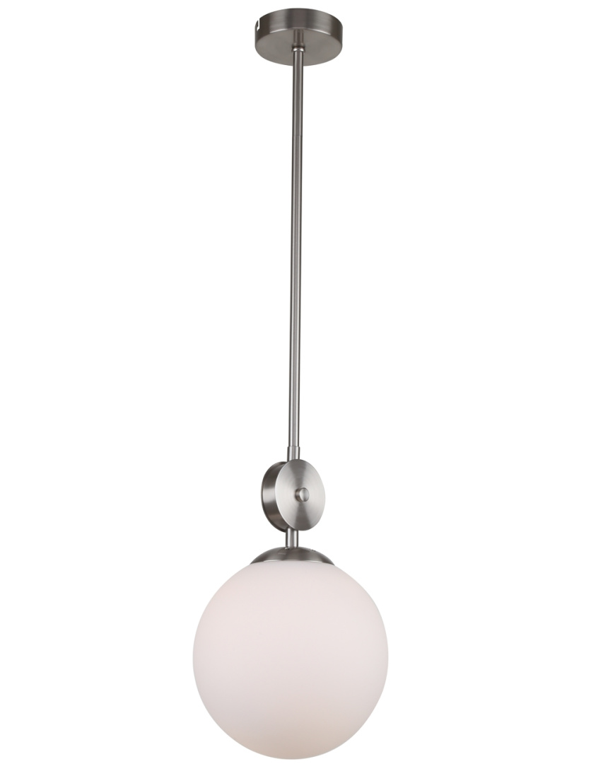Светильник подвесной на штанге из коллекции Marsela выполнен из металла, гальванизированного в цвет никеля, и декорирован белым стеклянным матовым плафоном, а также металлическим медальоном, гальванизированным в цвет арматуры. Премиальное качество и неповторимыи? дизаи?н светильников идеально подои?дут как в классические, так и современные интерьеры.