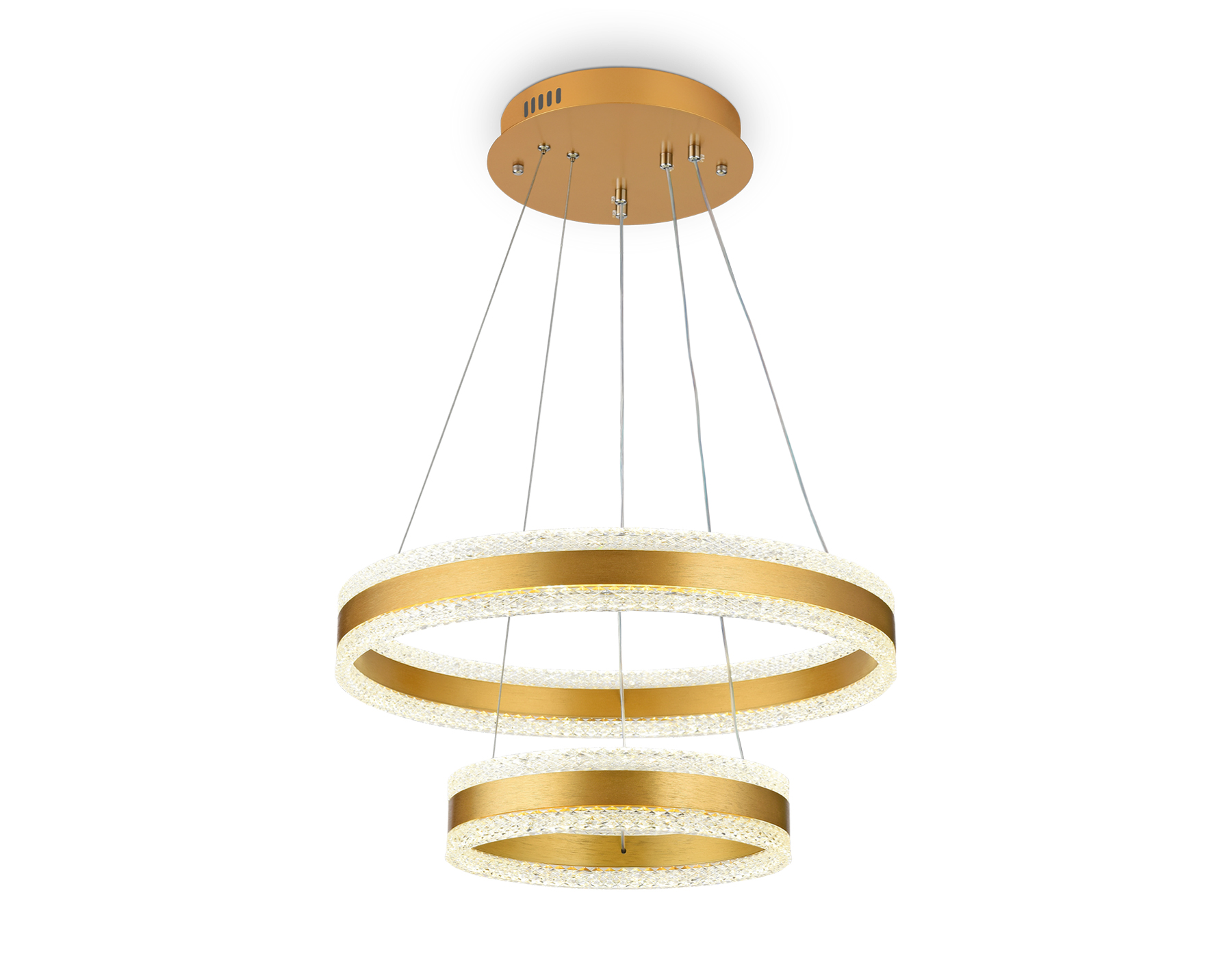 Подвесной светодиодный светильник из коллекции ACRYLICA Original. Великолепная модель FA6178 выполнена в современном стиле Неоклассика. Эта модель изготовлена из металлического корпуса золотого цвета и прозрачного акрила. Благодаря встроенным в конструкцию светодиодам, вы можете с уверенностью забыть о поиске или замене дополнительных ламп. С помощью мобильного приложения, а так же радиоуправляемого пульта вы сможете регулировать цветовую температуру, яркость освещения и ночной режим. Эта модель подходит для натяжных потолков и будет прекрасным дополнением в гостиной, спальне или детской комнате.