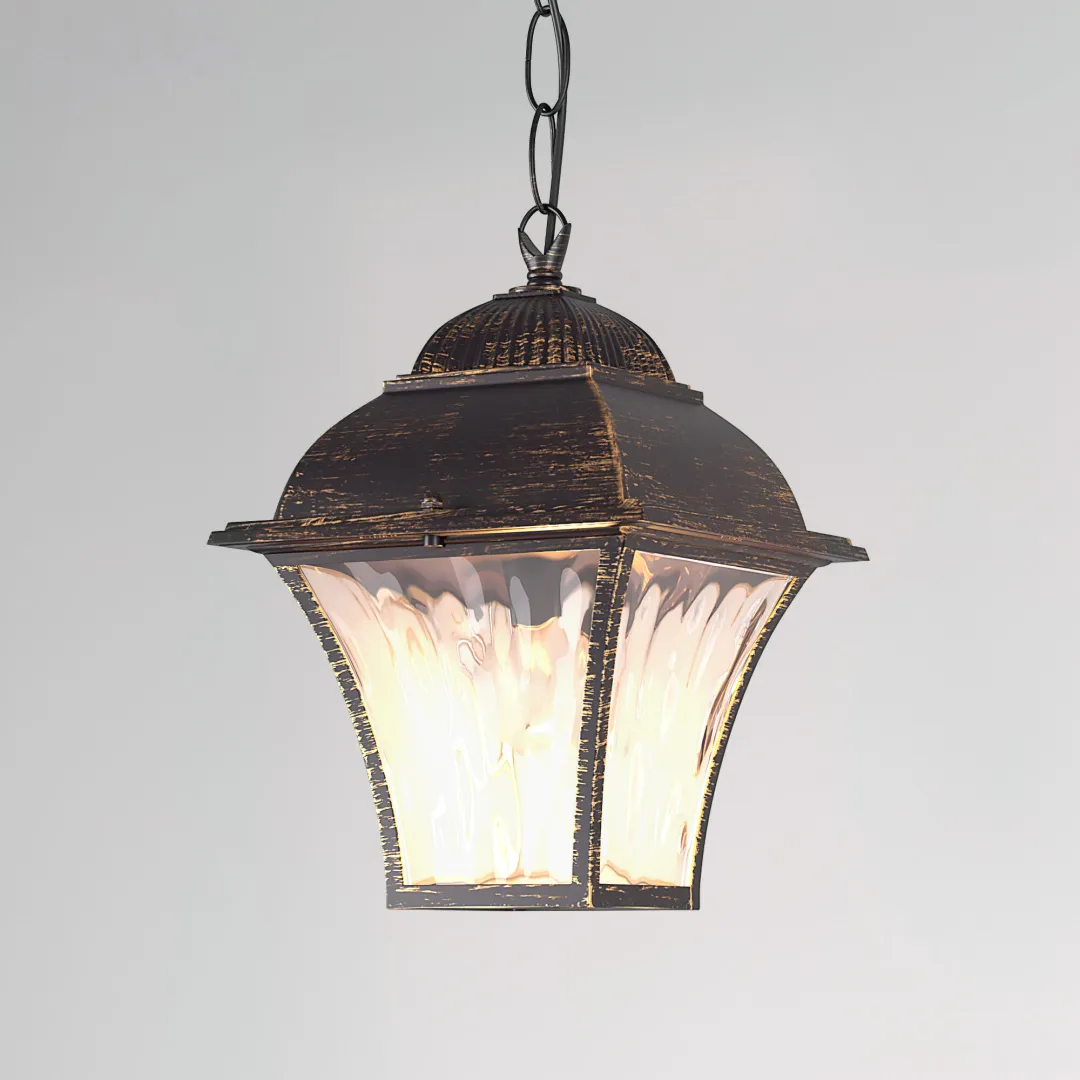 В качестве источника света используются сменные лампы с цоколем E27. Патрон рассчитан на максимальную мощность ламп накаливания 60 Вт. Корпус светильника выполнен из высококачественного и прочного металла с надежным покрытием. Уличный подвесной светильник Apus H черное золото IP33 легко монтируется при помощи крепежной планки, которая обеспечивает надежную фиксацию светильника.