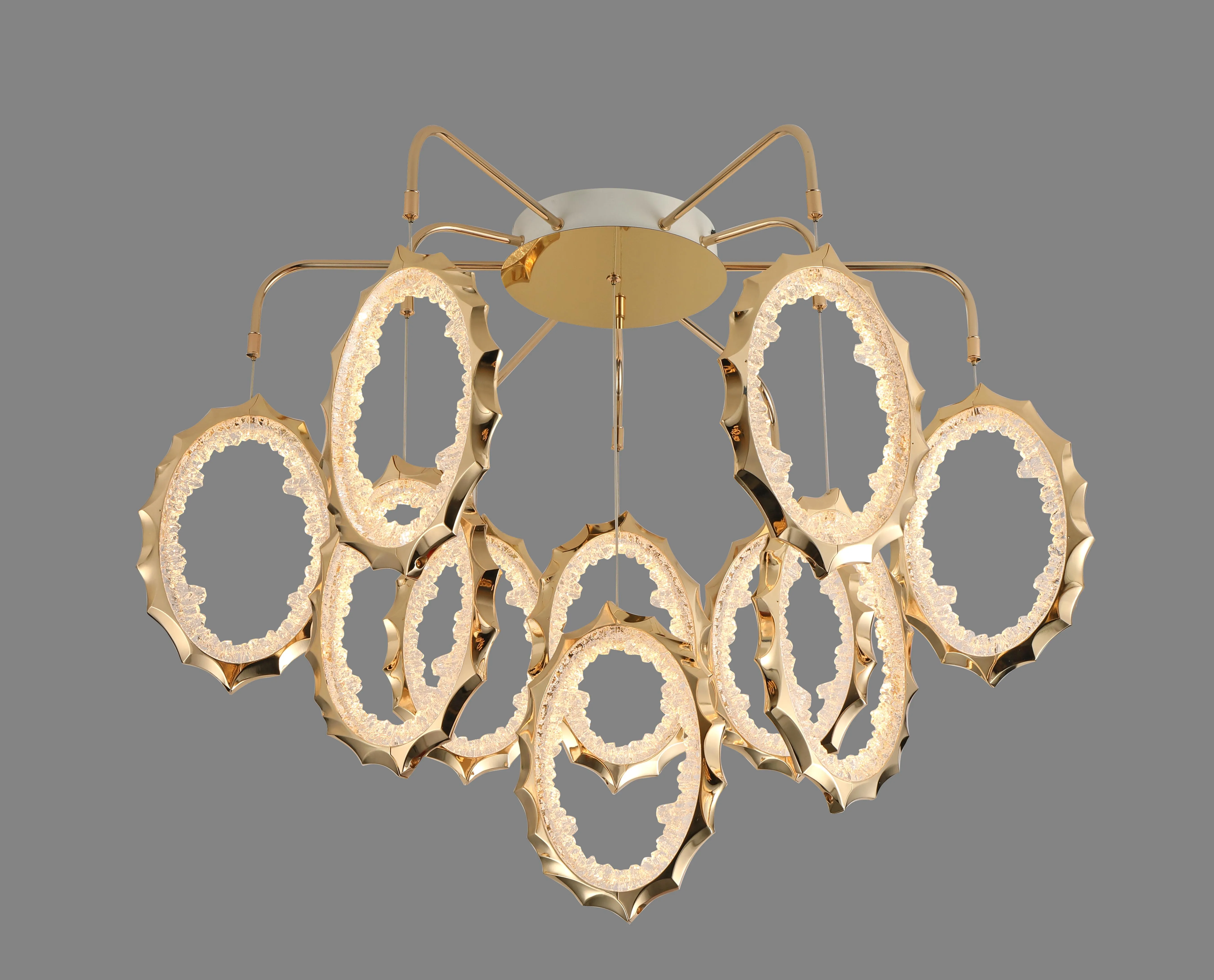 Высокая мощность освещения с использованием 13 светодиодных ламп делает эту модель идеальной для освещения площади от 15 до 25 квадратных метров. Кроме того, стильная золотая арматура и прозрачные плафоны добавляют изысканности и шарма. Высота люстры 1400 мм, диаметр 950 мм.