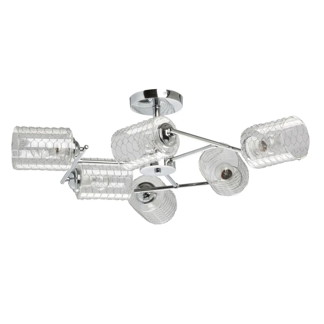 Металлическое основание потолочного светильника гальванизировано в цвет хрома. Прозрачные стеклянные плафоны оплетены сеткой в виде сот