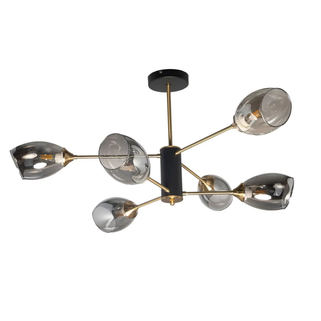 Металлическое основание потолочной люстры гальванизировано в цвет античной бронзы. Отдельные элементы основания окрашены в черный цвет. Потолочная люстра декорирована стеклянными плафонами, гальванизированными в дымчатый металлизированный цвет.