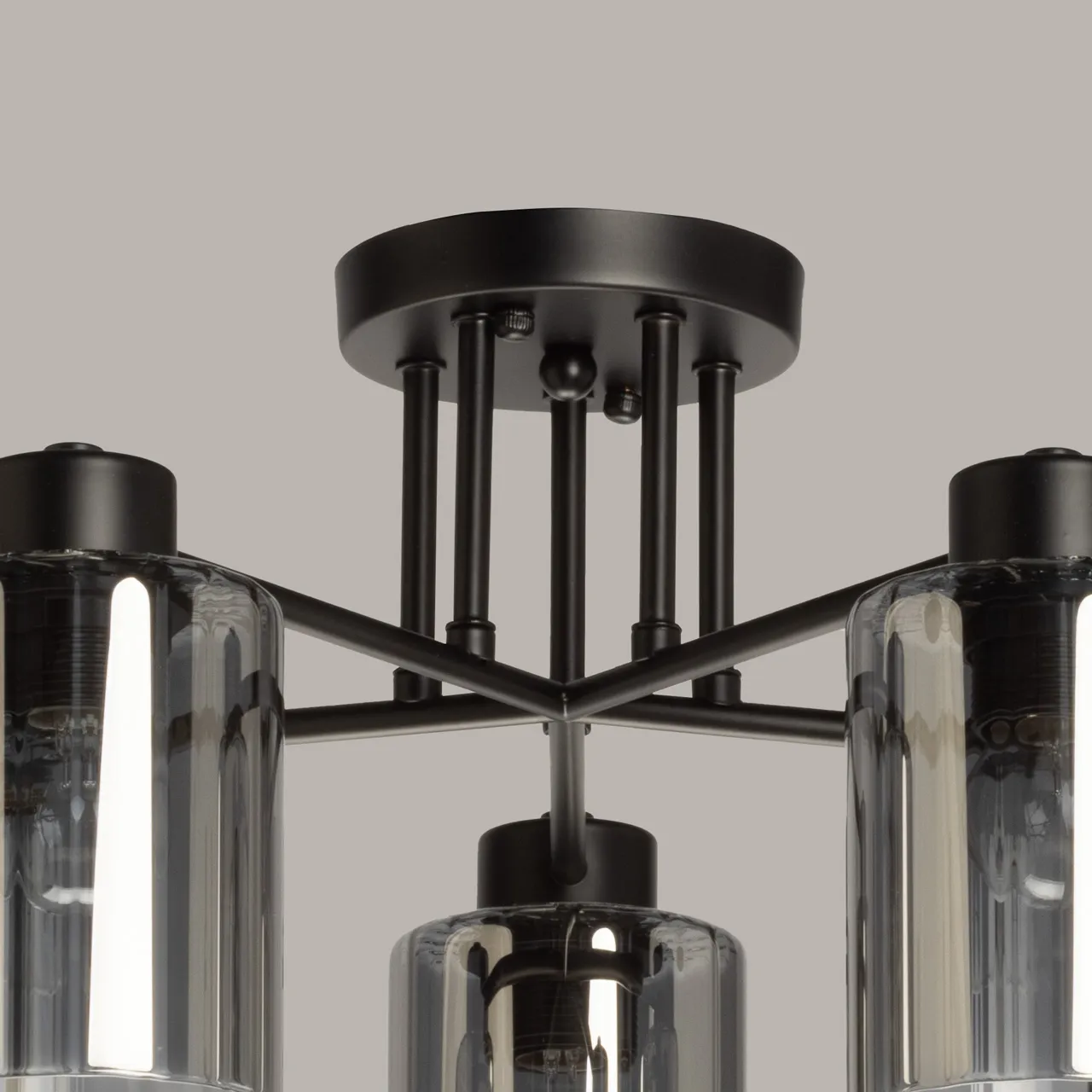 Элегантная потолочная люстра, выполненная в индустриальном стиле, станет стильным и функциональным дополнением любого интерьера. Её конструкция представляет собой пять изящных рожков из матового чёрного металла. Каждый рожок венчает цилиндрический плафон из дымчатого стекла, создающего мягкое, рассеянное освещение. Дымчатый оттенок стекла придает свету особую глубину и теплоту, прекрасно гармонируя с металлическим каркасом. Такая комбинация материалов создает интересный контраст текстур, что позволяет люстре эффектно смотреться как в классическом, так и в современном интерьере. Минимальная высота люстры составляет всего 24,5 см, что делает её подходящей для помещений с невысокими потолками.