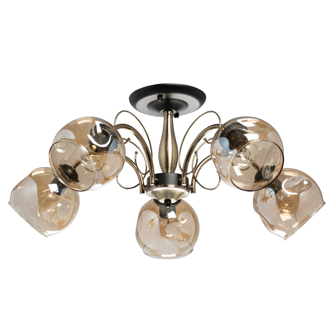 Основание светильника выполнено из металла и гальванизировано в цвет античной бронзы. Отдельные элементы основания окрашены в черный цвет. Cтеклянные плафоны отлиты в сложную форму и гальванизированы в цвет шампань.