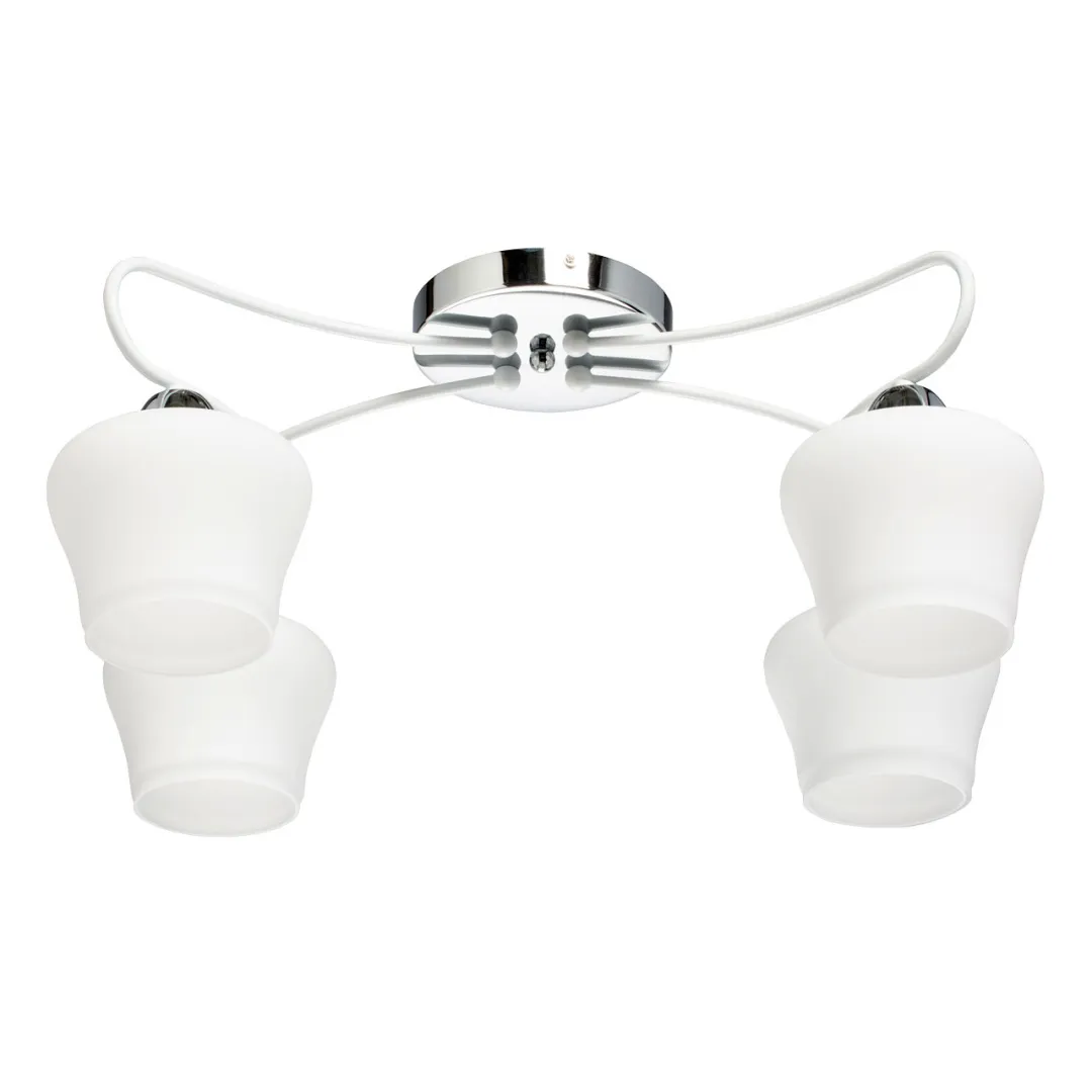 Основание светильника выполнено из металла. Потолочная чаша и держатели плафонов гальванизированы в цвет хрома, рожки окрашены в белый цвет. Стеклянные плафоны выдуваются вручную в форму и окрашены в белый цвет.