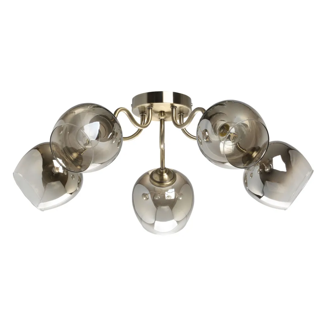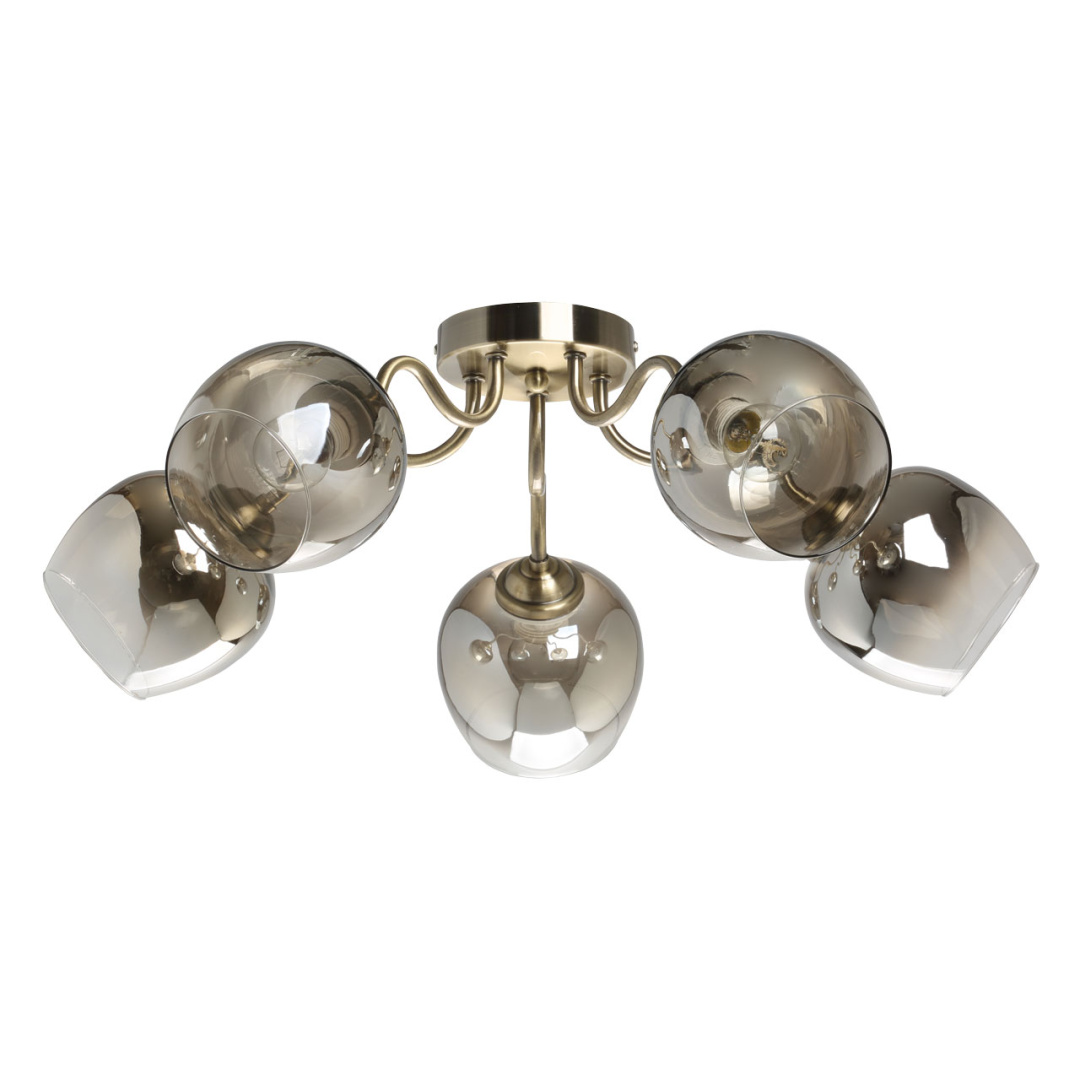 Металлическое основание потолочного светильника гальванизировано в цвет античной бронзы. Стеклянные плафоны выдуваются в форму и градиентно гальванизированы в цвет бронзы. Градиент уменьшается от основания плафона к внешнему краю.