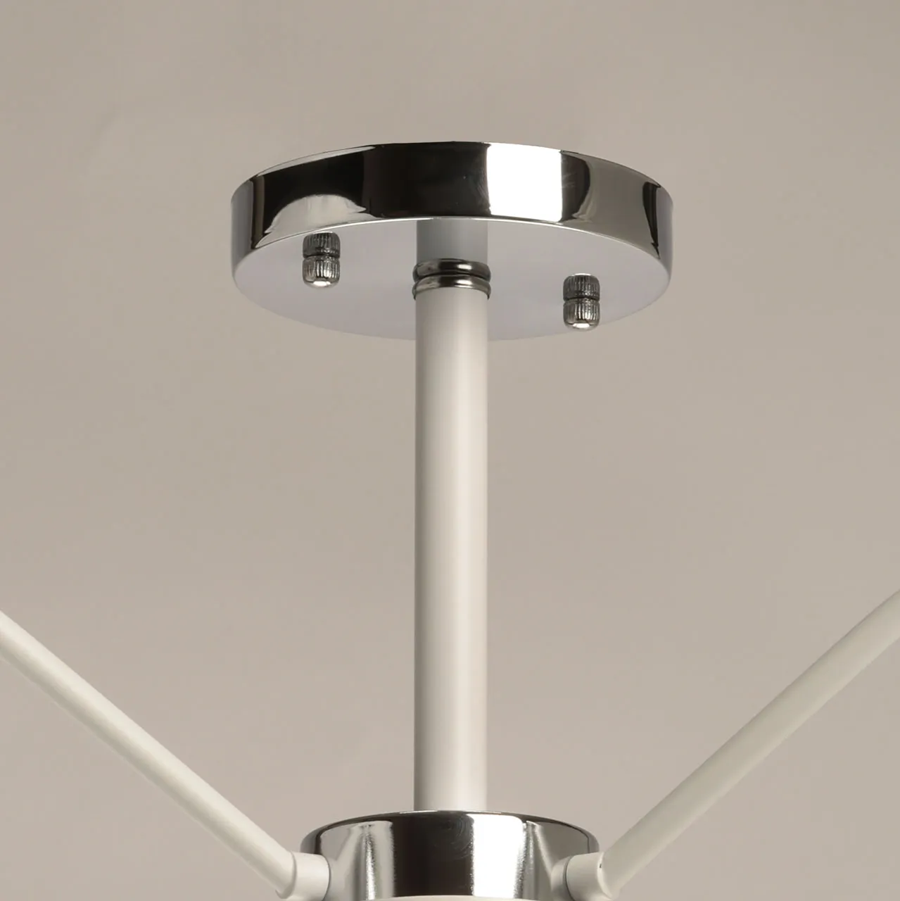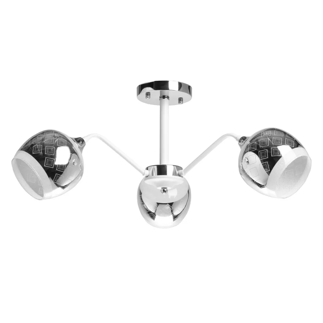 Металлическое основание потолочной люстры окрашено в белый цвет. Отдельные элементы основания гальванизированы в цвет хрома. Выдувные вручную стеклянные плафоны гальванизированы в дымчатый цвет и окрашены в белый цвет по трафарету. Край плафонов оплавлен. С внутренней стороны плафоны декорированы белой стеклянной крошкой.