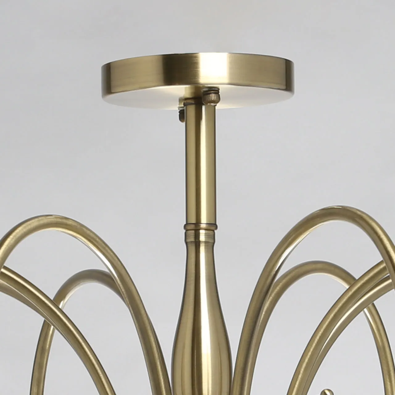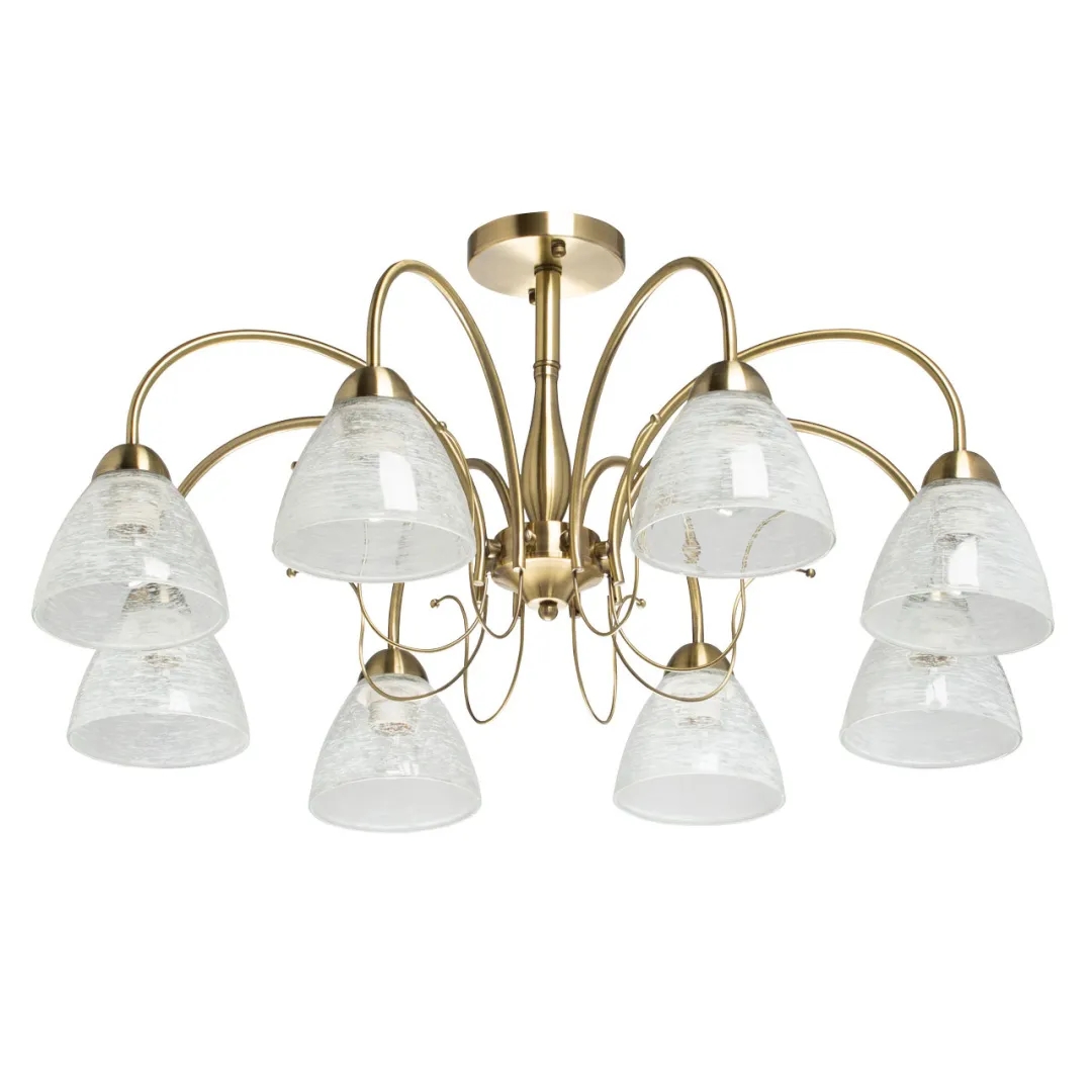 Металлическое основание светильника гальванизировано в цвет античной бронзы. На стеклянные плафоны нанесен рисунок белой краской в виде паутинки.