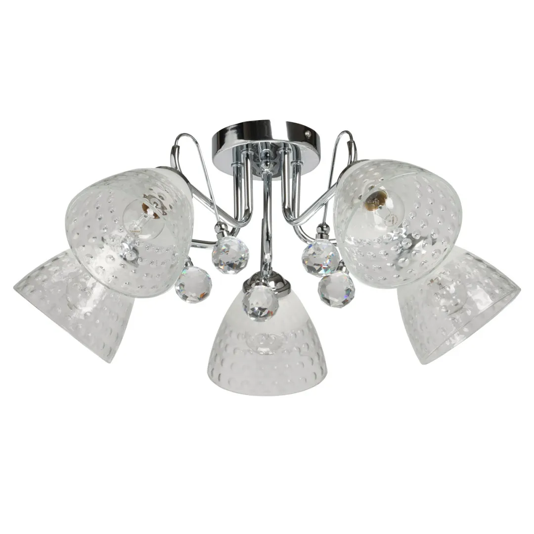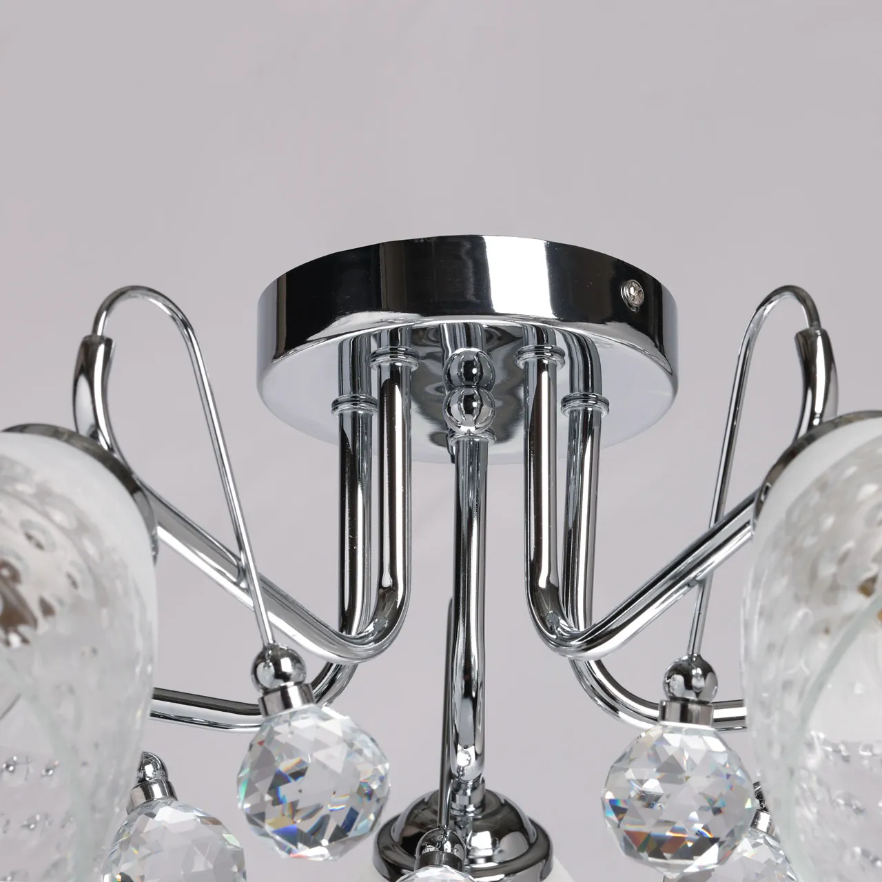 Металлическое основание потолочной люстры гальванизировано в цвет хрома. Плафоны из прозрачного фактурного стекла окрашены в белый цвет у основания. Люстра декорирована прозрачным хрусталем в форме шара.