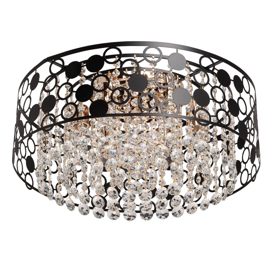 Металлическое основание светильника гальванизировано в цвет золота. Металлический плафон с геометричным орнаментом, выполненным по технологии лазерной резки, окрашен в черный цвет. Люстра декорирована прозрачным хрусталем круглой формы.