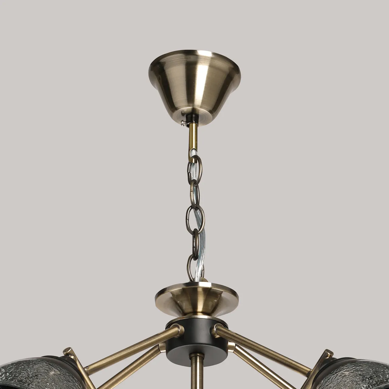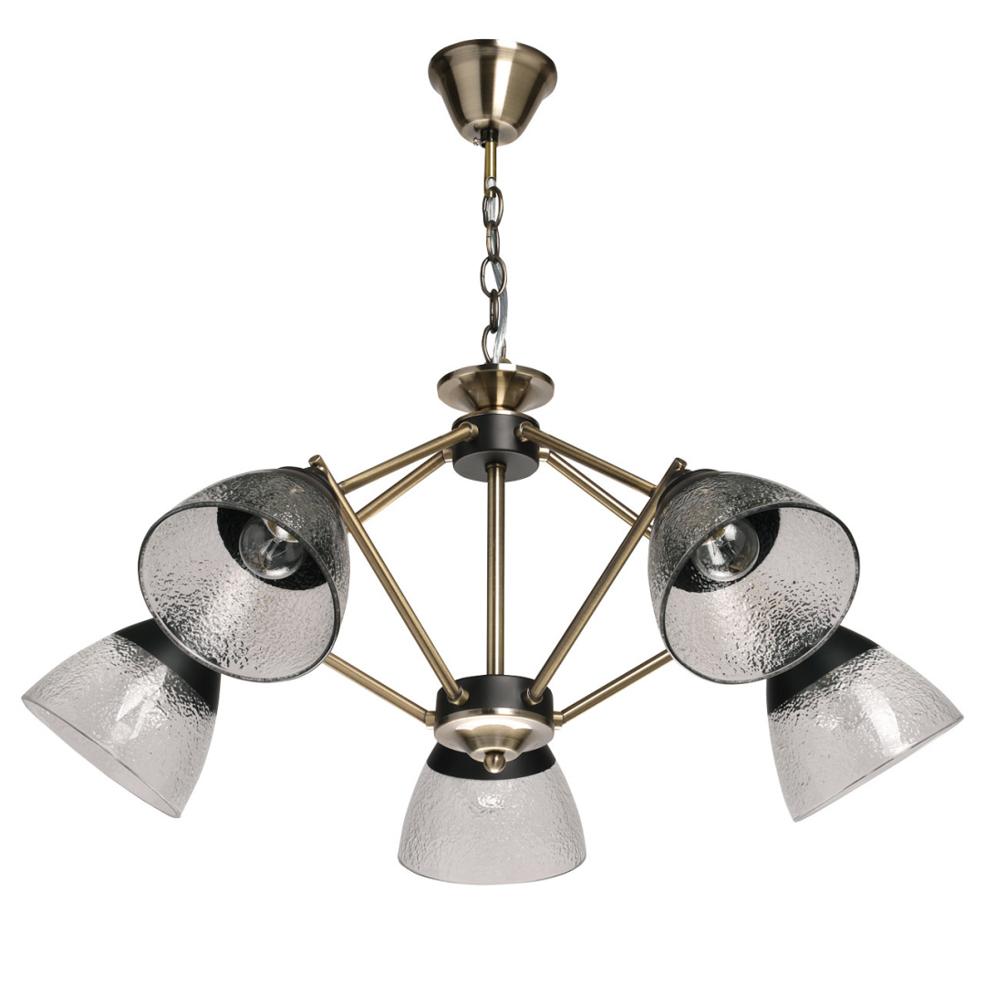 Металлическое основание подвесной люстры гальванизировано в цвет латуни. Отдельные элементы основания окрашены в черный цвет. Плафоны отлиты из прозрачного фактурного стекла. У основания плафоны окрашены в черный цвет.
