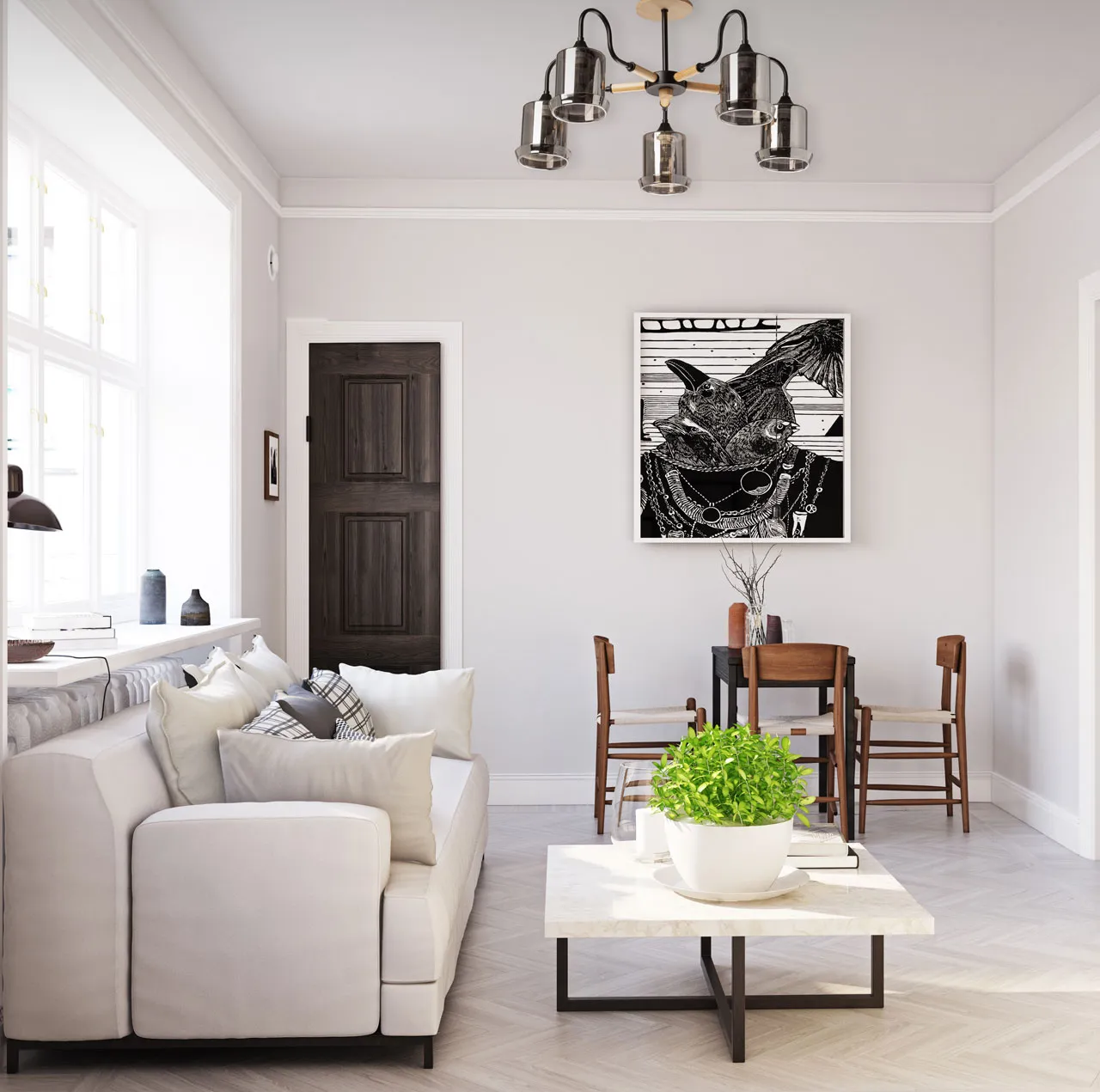 Металлическое основание потолочной люстры окрашено в черный цвет. Стеклянные плафоны отлиты в оригинальную форму и гальванизированы в дымчатый цвет. Потолочная люстра декорирована элементами из натурального светлого дерева.