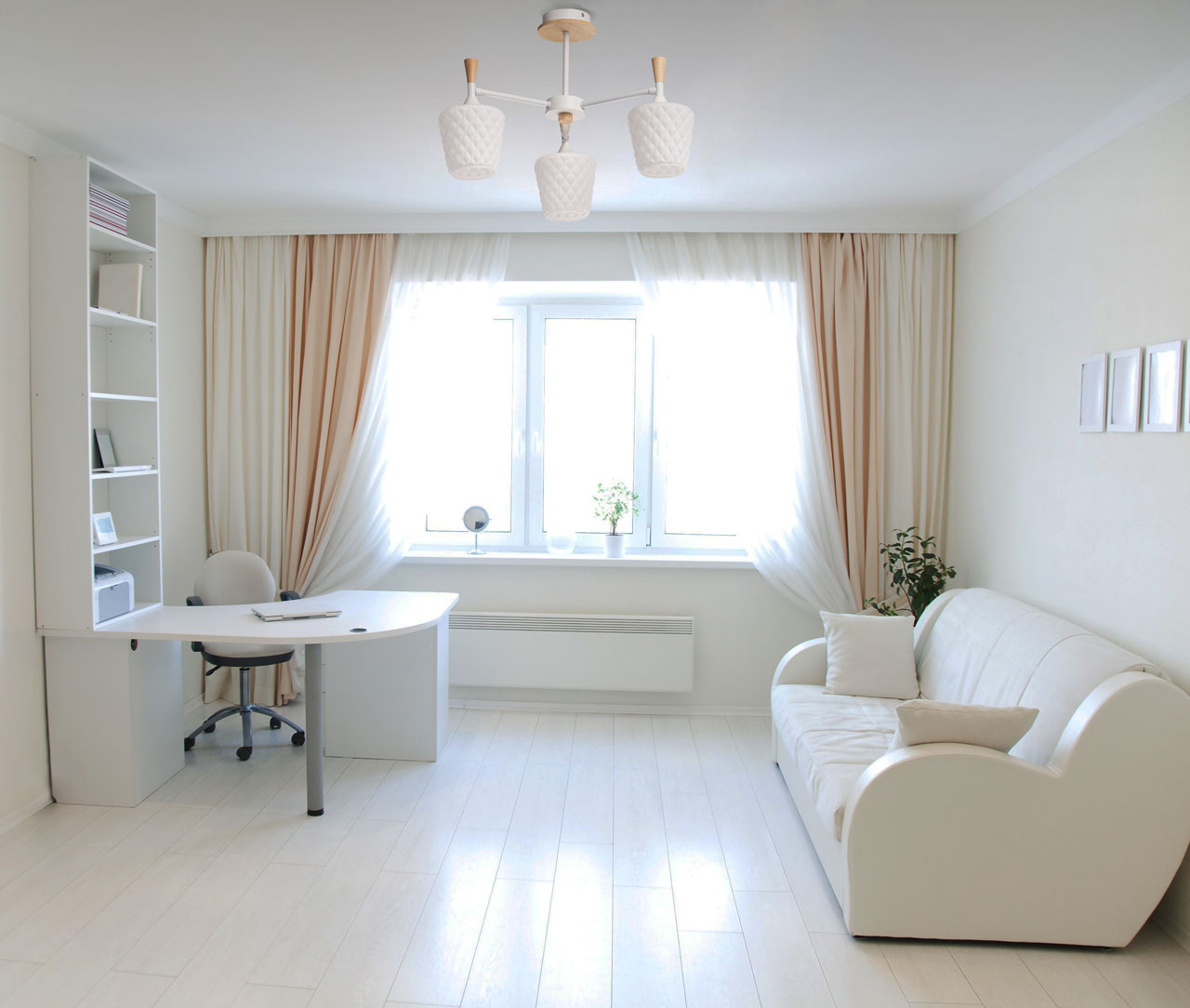 Металлическое основание потолочной люстры окрашено в белый цвет. Фактурные стеклянные плафоны окрашены в белый цвет. Потолочная люстра декорирована элементами из светлого натурального дерева.