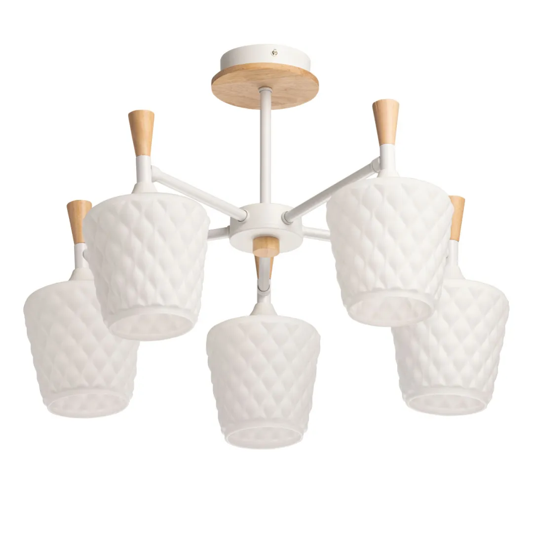 Металлическое основание потолочной люстры окрашено в белый цвет. Фактурные стеклянные плафоны окрашены в белый цвет. Потолочная люстра декорирована элементами из светлого натурального дерева.