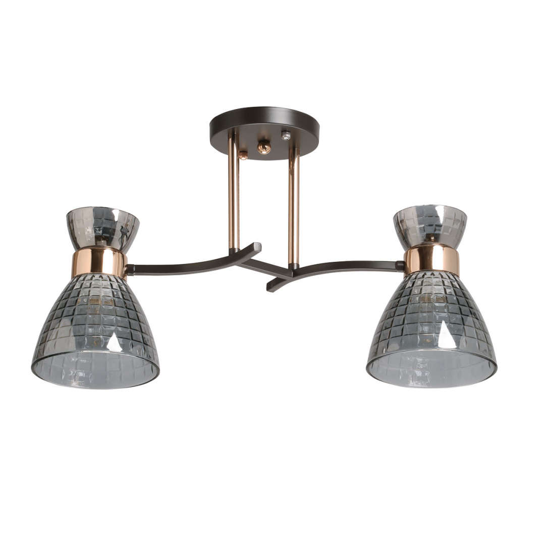 Металлическое основание потолочной люстры окрашено в цвет кофе. Отдельные элементы основания гальванизированы в цвет золота. Стеклянные плафоны с геометричным орнаментом отлиты в сложную форму и гальванизированы в дымчатый цвет.
