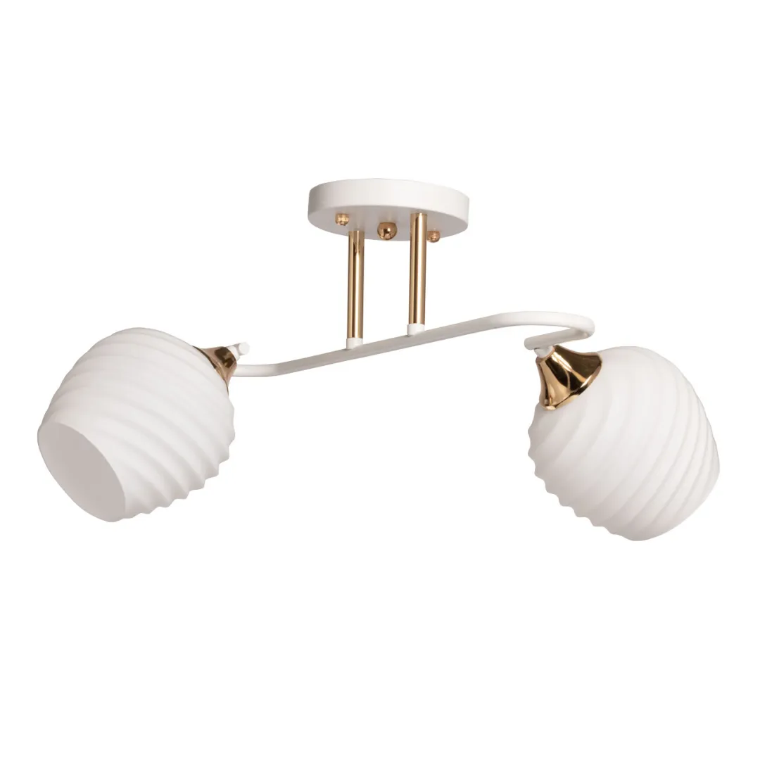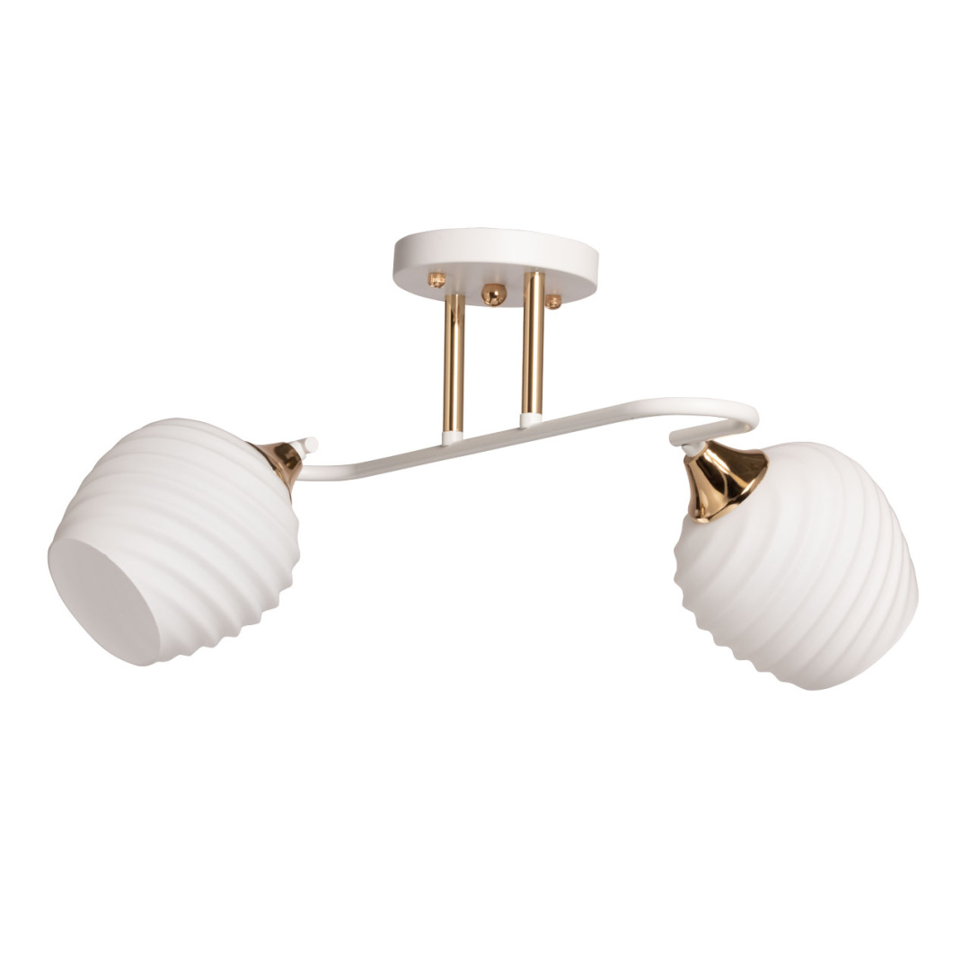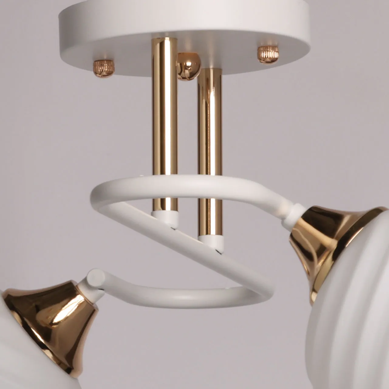 Металлическое основание потолочной люстры окрашено в белый цвет. Отдельные элементы основания гальванизированы в цвет золота. Стеклянные плафоны отлиты в сложную форму и матированы.