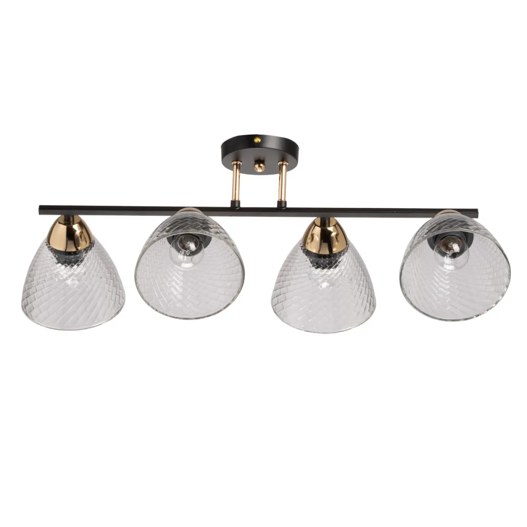 Металлическое основание потолочной люстры окрашено в черный цвет. Отдельные элементы основания гальванизированы в цвет золота. Потолочный светильник декорирован плафонами из прозрачного фактурного стекла.