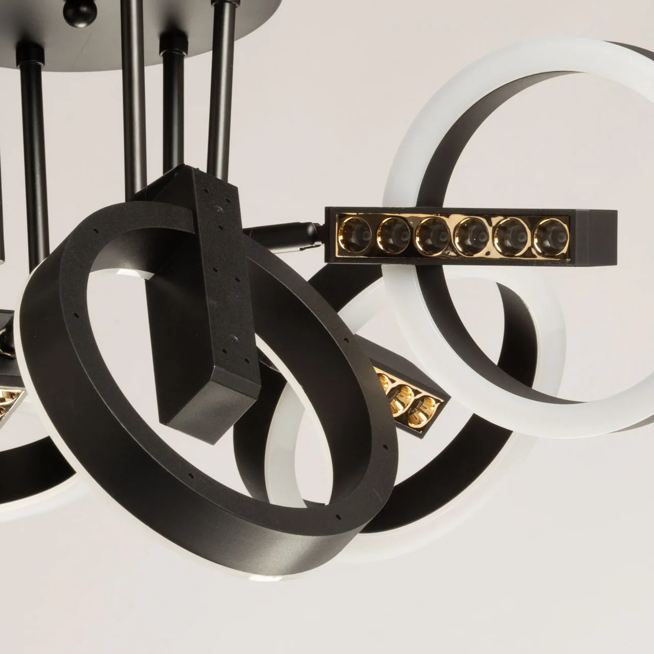 Металлическое основание подвесной люстры окрашено в черный цвет. Корпус плафонов выполнен из сплава алюминия и окрашен в цвет основания. Светодиодные источники декоративного света закрыты матовым акрилом. Открытые функциональные точечные светодиоды углублены в корпус плафонов.