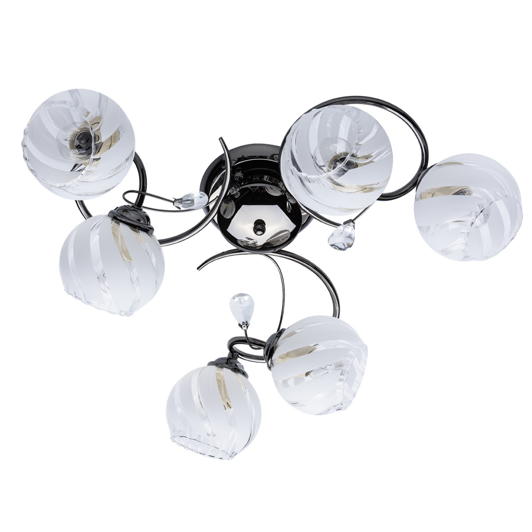 Светильник декорирован стеклянными плафонами округлой формы, отлитыми в сложную форму, с последующим матированием внешней поверхности по трафарету. Края плафонов обработаны по технологии оплавления. Декоративные элементы на завитках из декоративного стекла в форме миндаля.