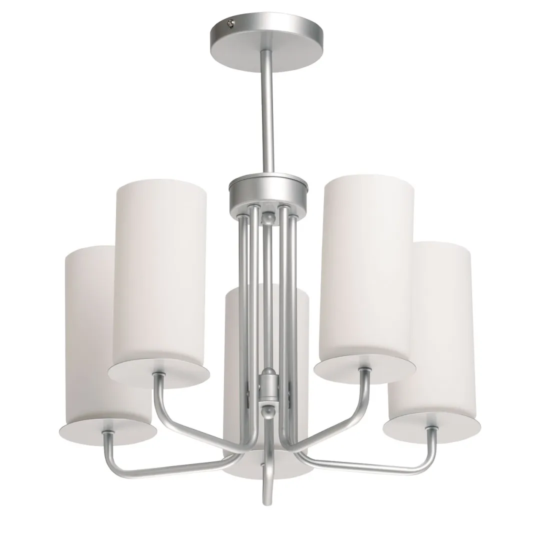 Металлическое основание люстры окрашено в цвет перламутрового серебра. Стеклянные плафоны окрашены в белый цвет.