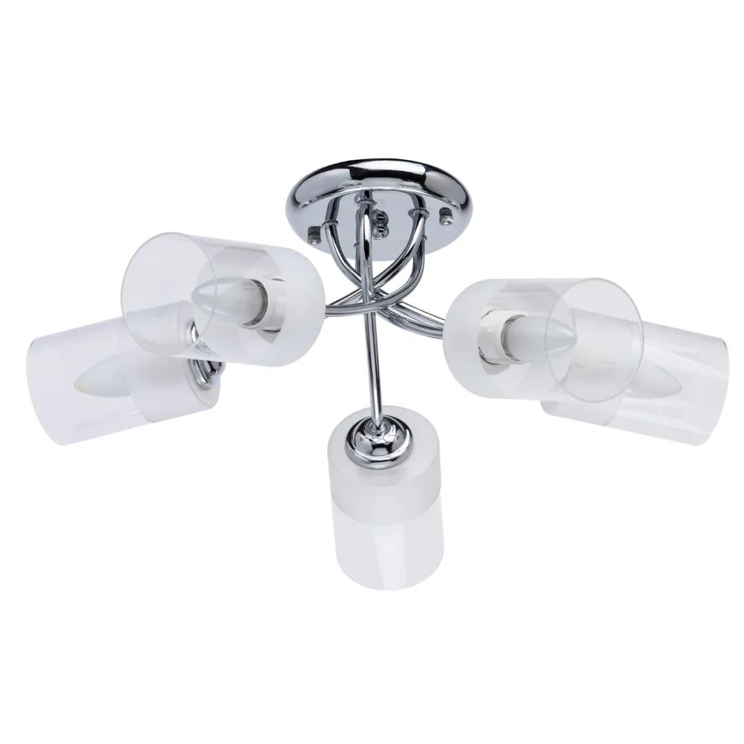 Основание светильника выполнено из металла и гальванизировано в цвет хрома. Стеклянные плафоны отлиты в форму и наполовину матированы .