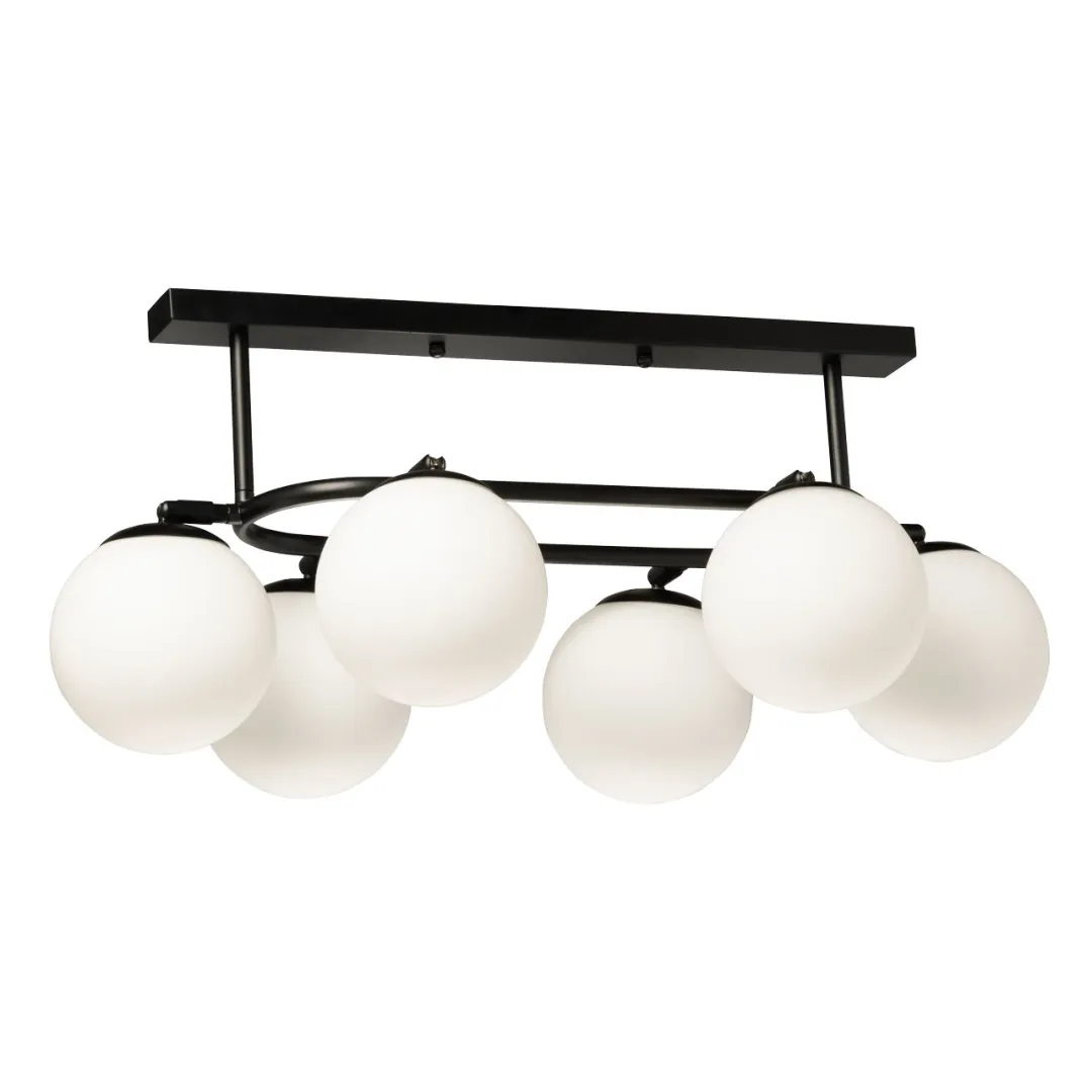 Металлическое основание потолочной люстры окрашено в черный цвет. Светильник декорирован стеклянными плафонами белого матового цвета.