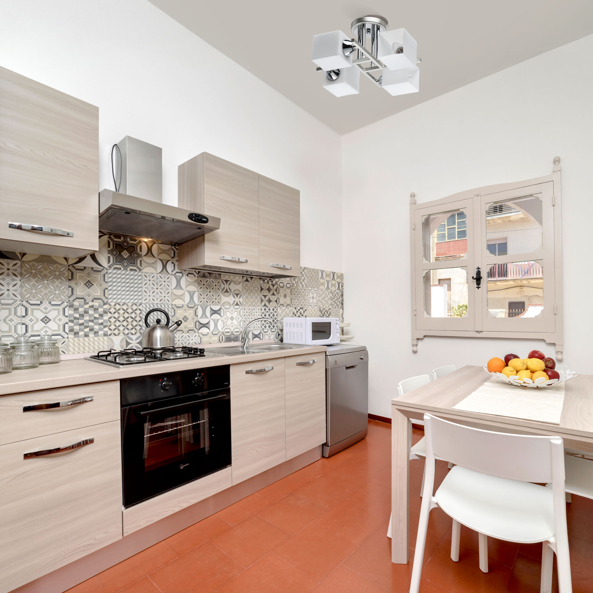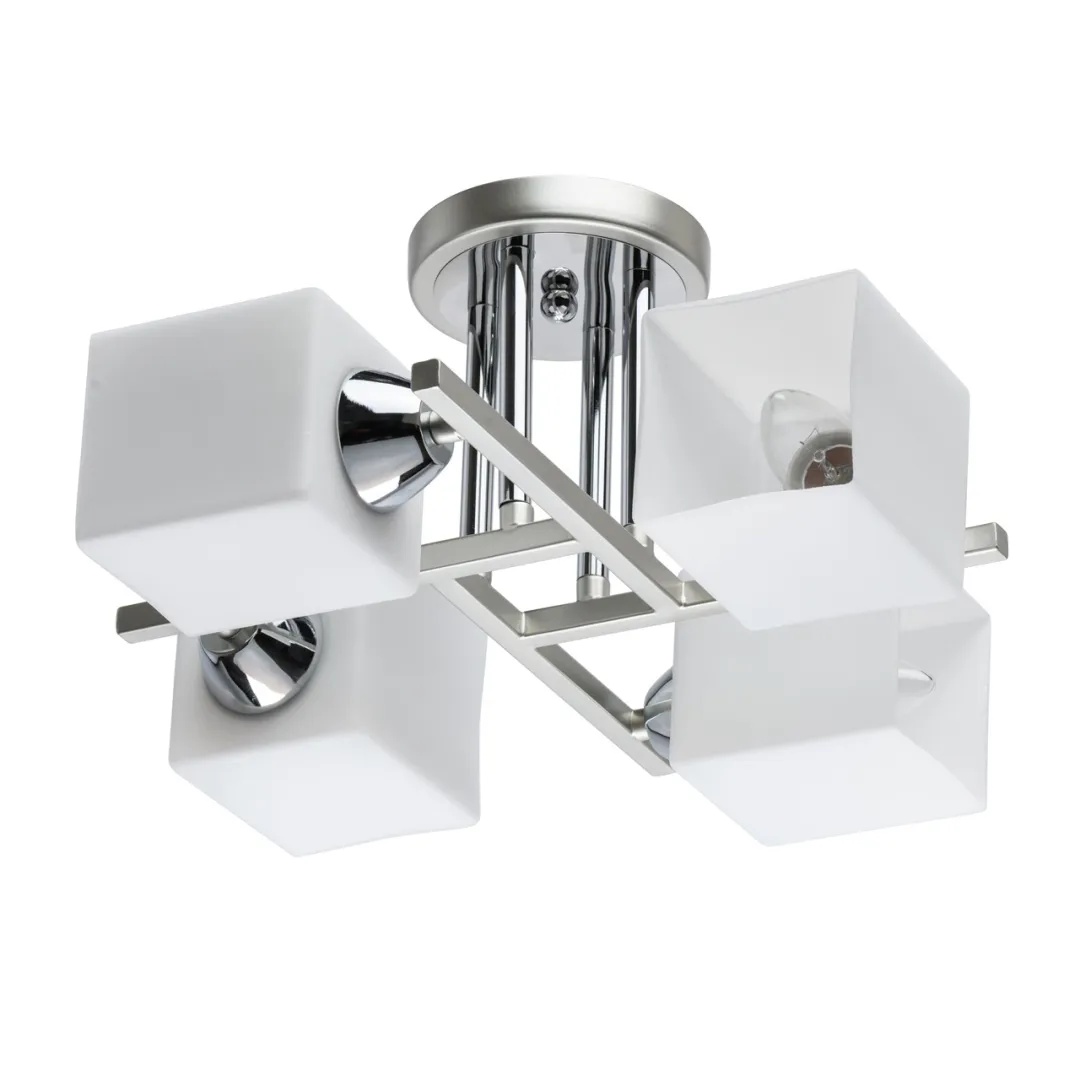 Основание светильника выполнено из металла и окрашено в цвет перламутрового серебра. Отдельные элементы основания гальванизированы в цвет хрома. Светильник декорирован стеклянными плафонами, окрашенными в белый цвет с внутренней стороны.